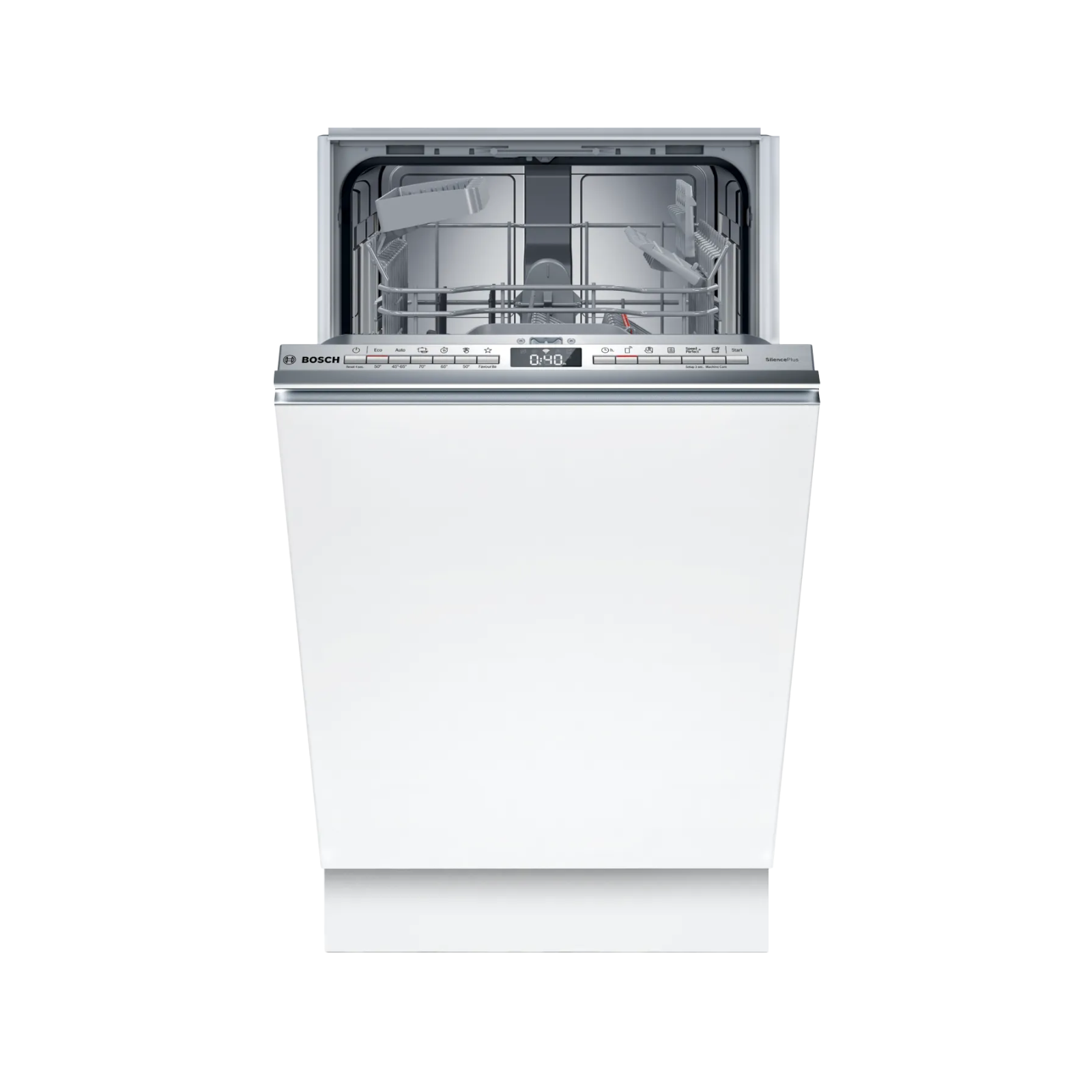 Bosch SPV4EKX24E to zmywarka do zabudowy o szerokości 45 cm z silnikiem EcoSilence Drive, systemem EfficientDry i zdalnym sterowaniem Home Connect. Posiada 6 programów, funkcję SpeedPerfect Plus, zabezpieczenie AquaStop i regulowany kosz VarioFlex, który ułatwia załadunek naczyń.