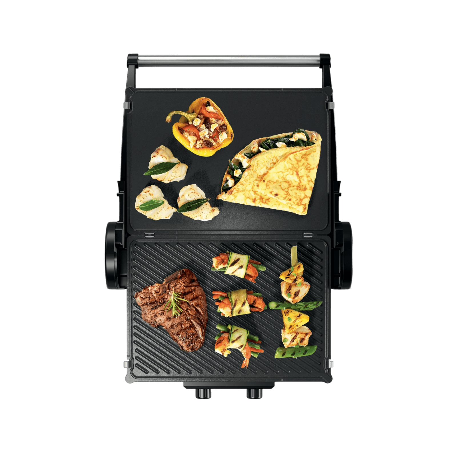 Dwa niezależne regulatory temperatury dla górnej i dolnej płyty umożliwiają idealne dopasowanie ciepła do każdego rodzaju potrawy – od mięsa i ryb, po warzywa, pieczywo i ziemniaki. Dzięki tej funkcji uzyskasz perfekcyjnie przypieczone steki – chrupiące na zewnątrz, soczyste w środku. Pełna kontrola, szybkie efekty i niezawodna wygoda – gotuj jak profesjonalista w swojej własnej kuchni.