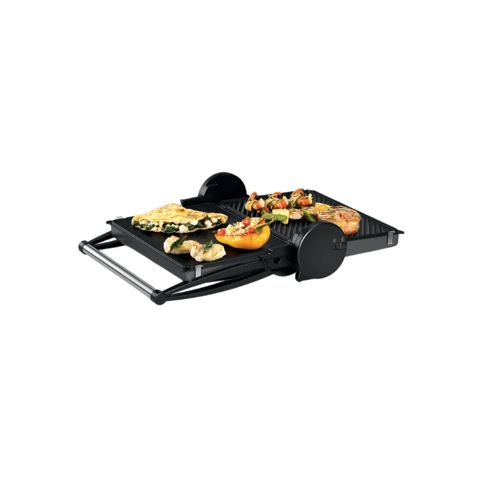 Trzy tryby pracy – zamknięty, otwarty i półotwarty – pozwalają wykorzystać grill jako kontaktowy, stołowy lub piekarnik do zapiekania i podgrzewania. Przygotujesz na nim soczyste steki, złociste tosty, kanapki panini czy chrupiące szaszłyki. Dwustronne płyty – żebrowana i gładka – umożliwiają grillowanie z minimalną ilością tłuszczu, gwarantując zdrowsze i równie pyszne rezultaty. Idealny dla miłośników kreatywnego gotowania.
