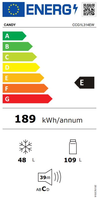 Lodówka Candy CCG1L314EW to wolnostojąca chłodziarko-zamrażarka o całkowitej pojemności 157 litrów, z czego 109 litrów przypada na chłodziarkę, a 48 litrów na zamrażarkę. Dzięki kompaktowym wymiarom (wysokość: 144 cm, szerokość: 47 cm, głębokość: 49,5 cm) urządzenie idealnie sprawdzi się w mniejszych kuchniach, aneksach kuchennych czy mieszkaniach typu studio.