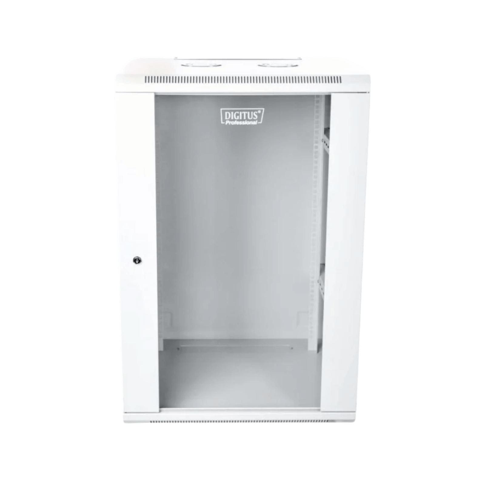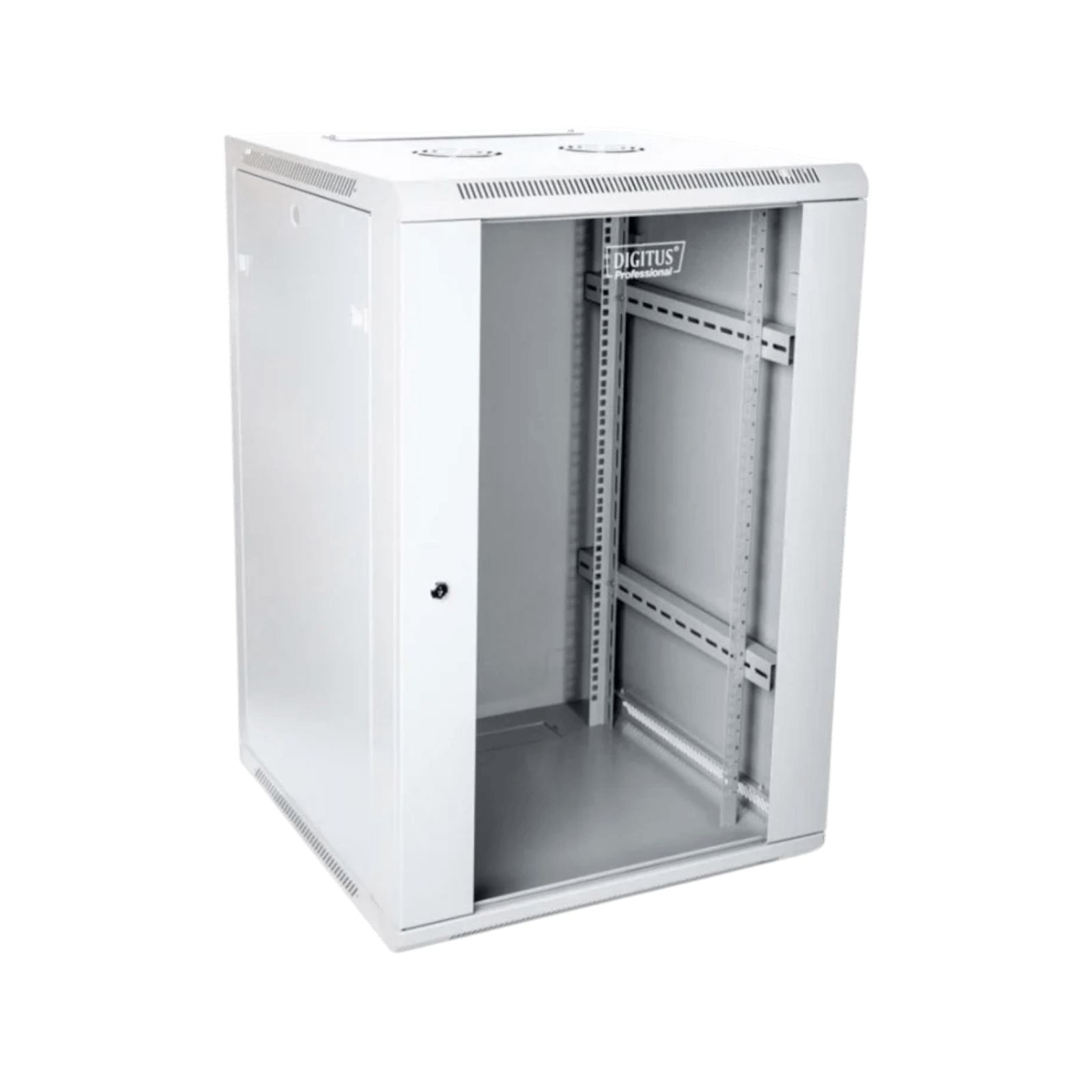 Szafa rack Digitus 19" 15U o wymiarach 600x600 mm to wisząca konstrukcja w kolorze szarym, idealna do montażu urządzeń w standardzie 19". Wyposażona w szklane drzwi przednie, umożliwia łatwy wgląd do zainstalowanego sprzętu. Solidna budowa zapewnia ochronę i organizację urządzeń sieciowych oraz telekomunikacyjnych.