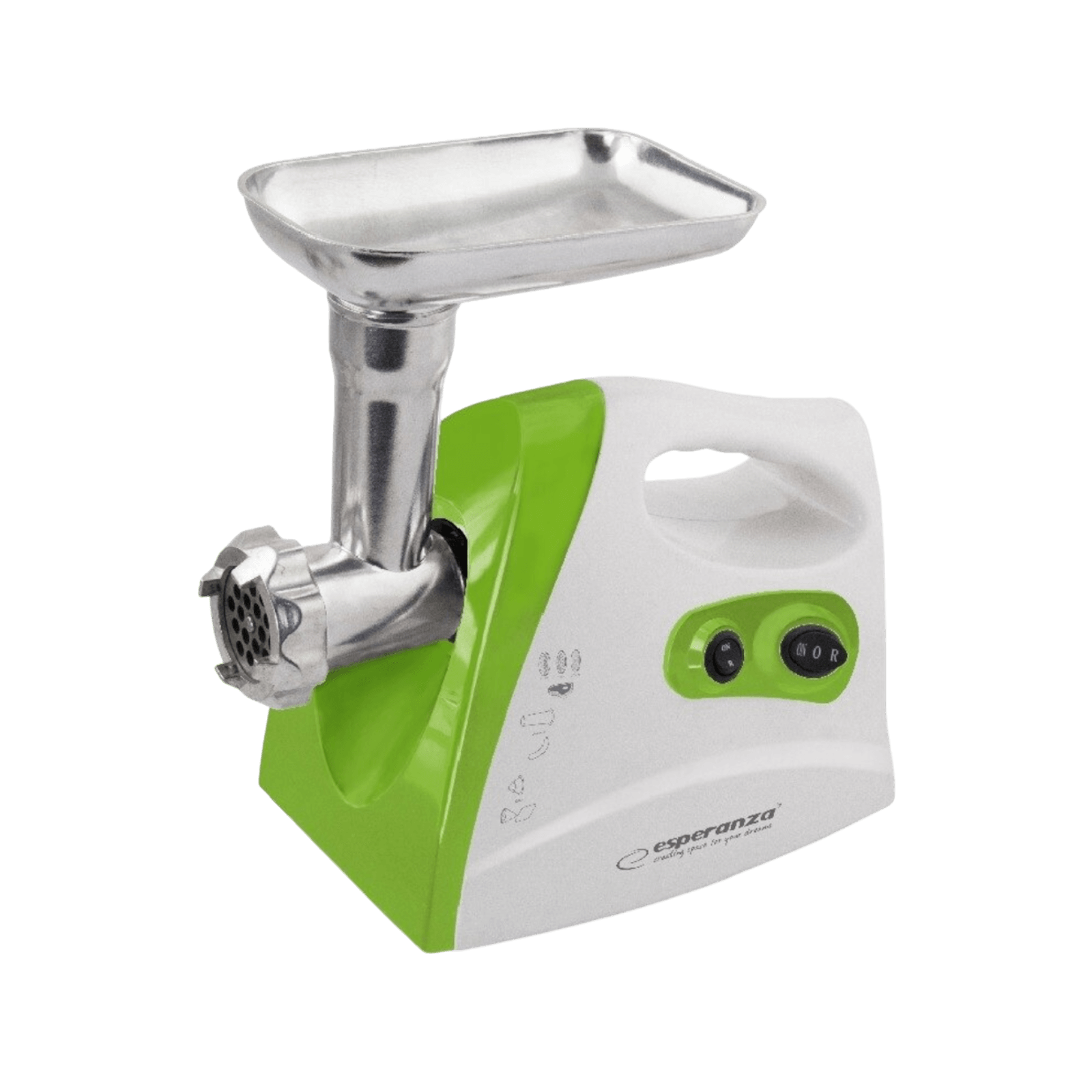 Maszynka do mięsa koloru zielonego Esperanza EKM012G (600 W) umożliwia mielenie z regulacją grubości dzięki trzem sitkom (2,7 mm, 4 mm, 8 mm). Nasadki do kiełbas i kebbe zwiększają funkcjonalność. Antypoślizgowe nóżki zapewniają stabilność, a kompaktowy design ułatwia przechowywanie. Idealna do domowej kuchni.