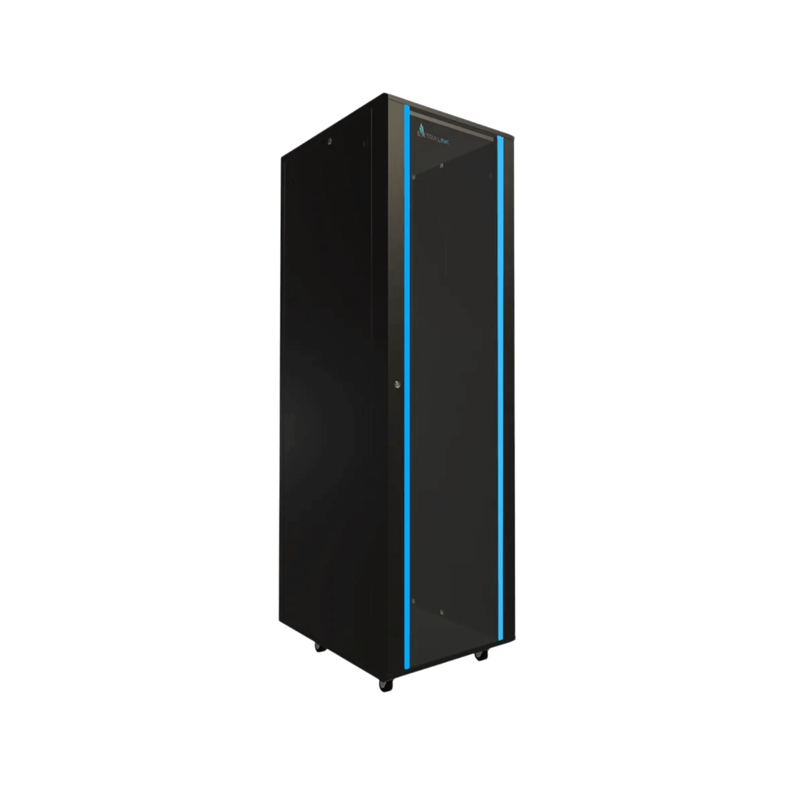 Extralink 42U 600x800 mm to stojąca szafa rack w kolorze czarnym, idealna do biur, serwerowni i systemów CCTV. Wyposażona w przeszklone drzwi, zdejmowane panele boczne i oznaczone szyny pionowe, zapewnia wygodny montaż oraz ochronę urządzeń w standardzie 19".