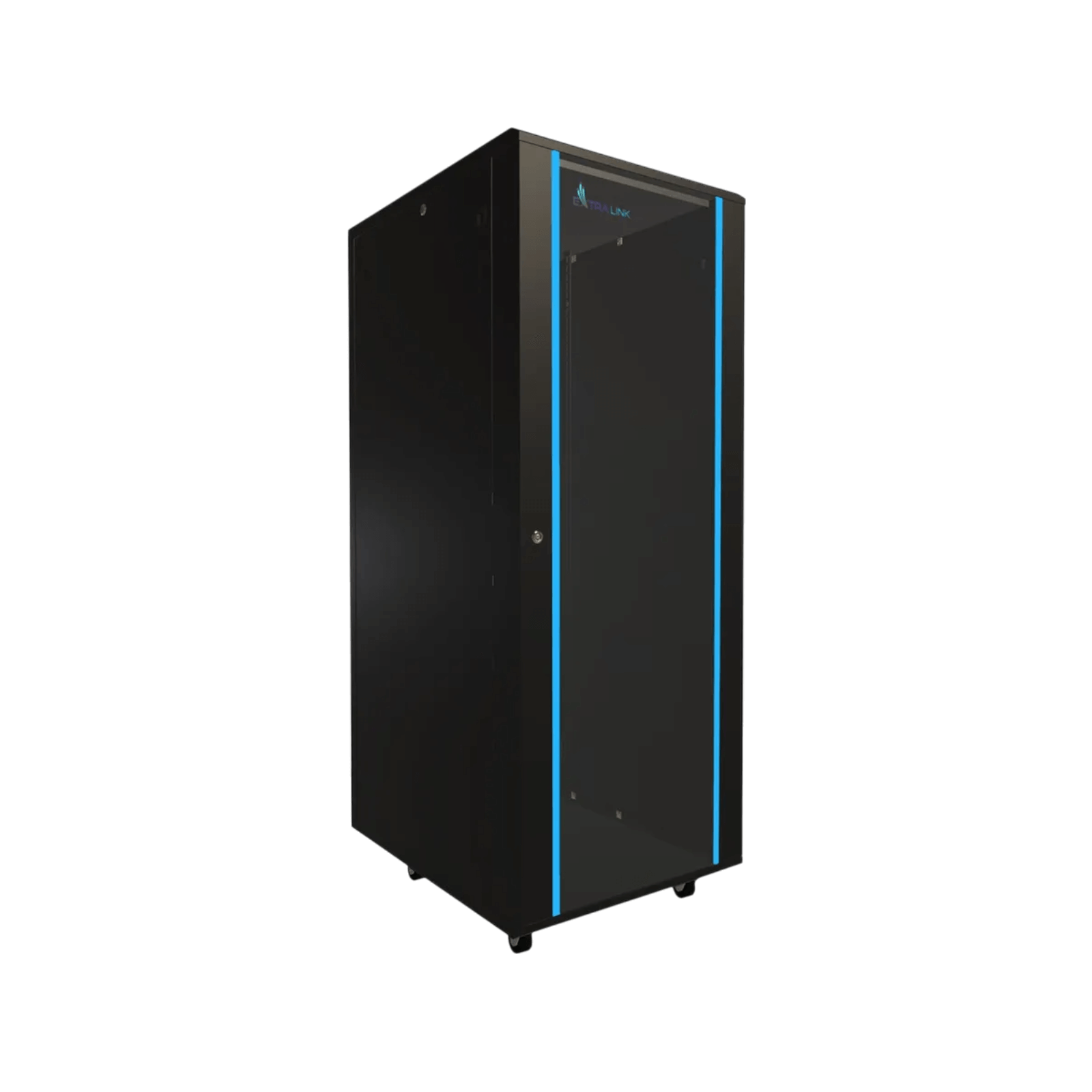 Extralink 32U 600x800 mm to stojąca szafa rack w kolorze czarnym, idealna do biur, serwerowni i systemów CCTV. Wyposażona w przeszklone drzwi, zdejmowane panele boczne oraz oznaczone szyny pionowe, zapewnia wygodny montaż i ochronę urządzeń w standardzie 19".