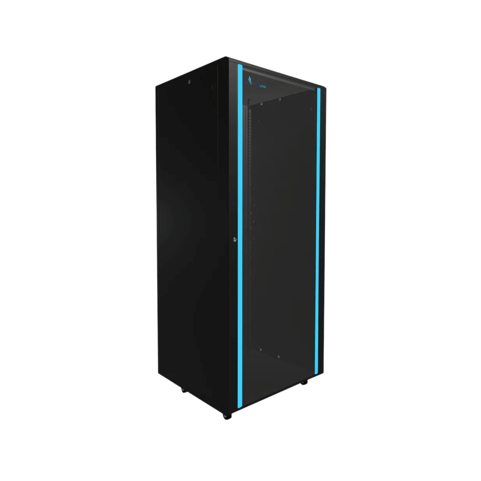 Extralink 42U 800x800 mm to stojąca szafa rack w kolorze czarnym, idealna do biur, serwerowni i systemów CCTV. Wyposażona w przeszklone drzwi, zdejmowane panele boczne i oznaczone szyny pionowe, zapewnia wygodny montaż oraz ochronę urządzeń w standardzie 19".