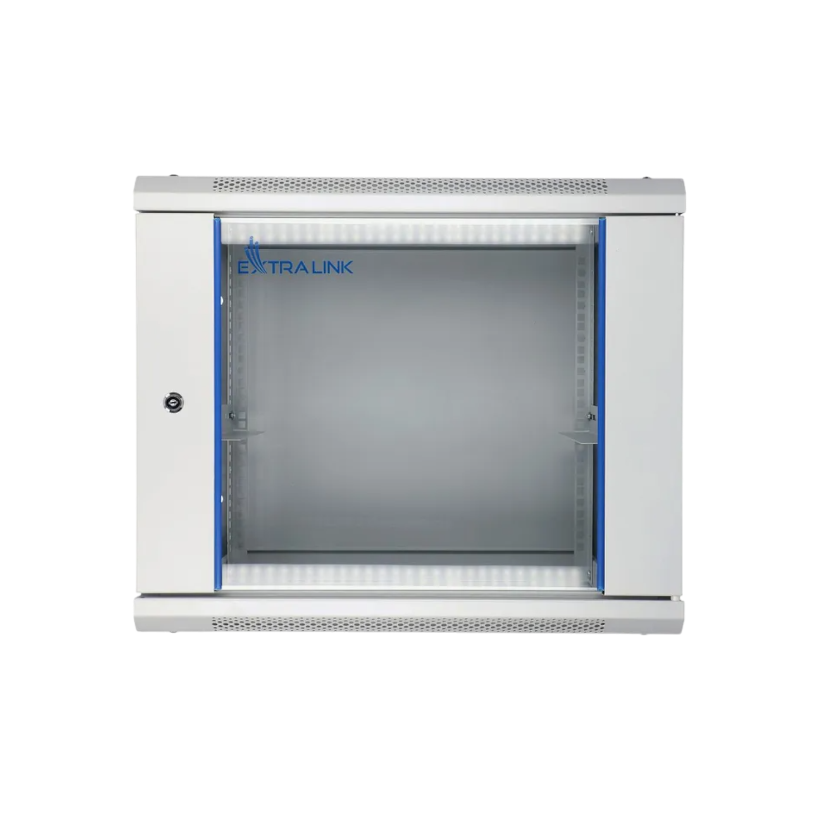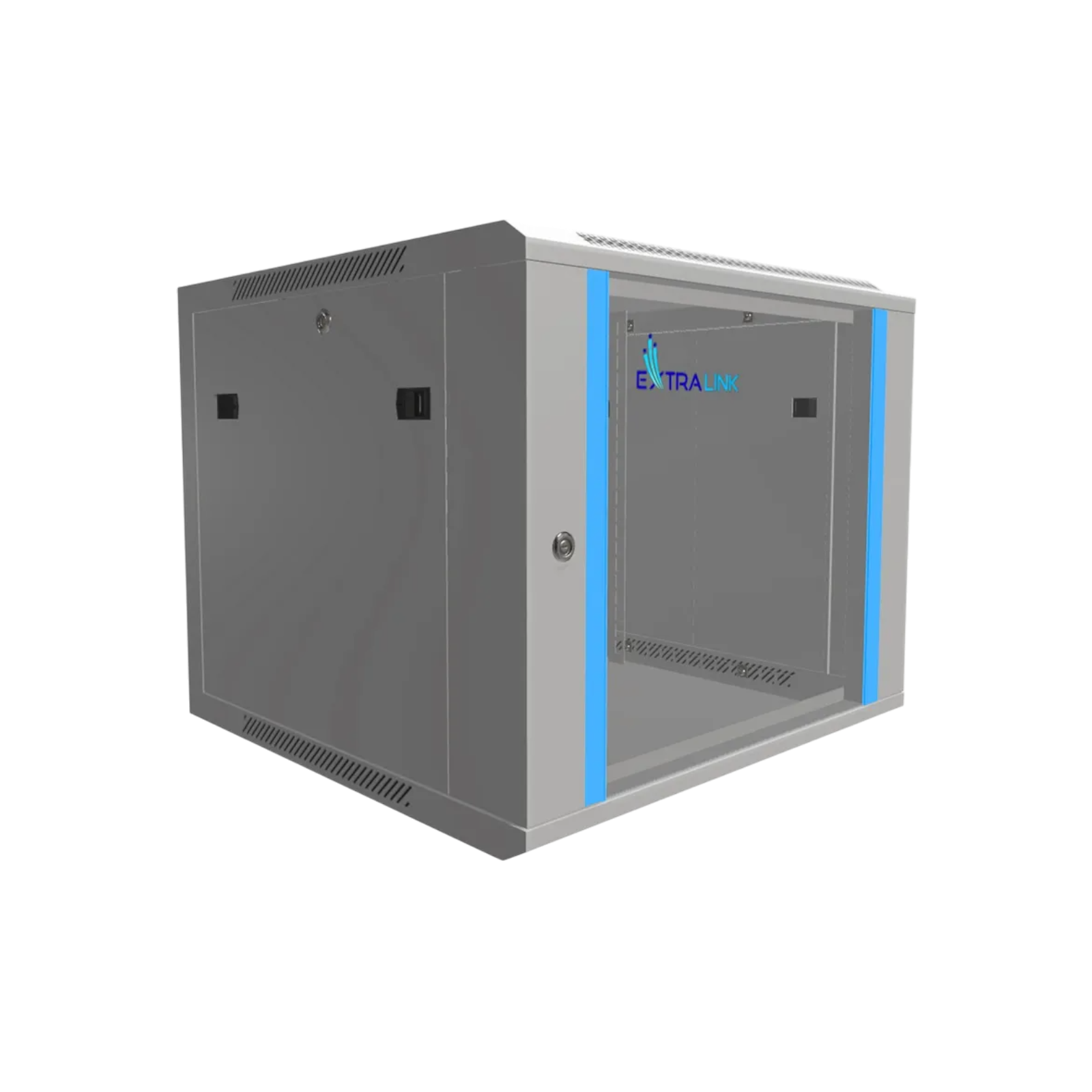 Extralink 9U 600x600 mm to wisząca szafa rack w kolorze szarym, idealna do biur, serwerowni i systemów CCTV. Wyposażona w przeszklone drzwi, zdejmowane panele boczne z zamkami oraz otwory na okablowanie, zapewnia wygodny montaż i ochronę urządzeń w standardzie 19".