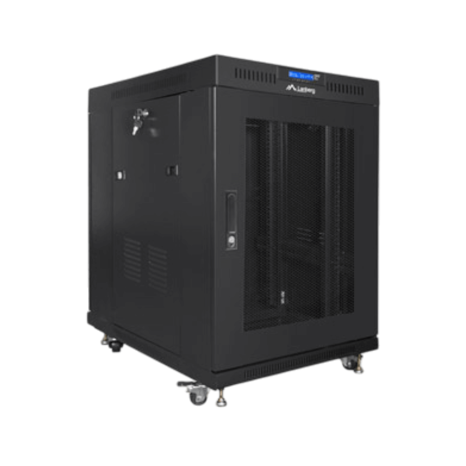 Lanberg 15U 800x1000 mm to stojąca szafa rack w kolorze czarnym, wykonana z wytrzymałej stali. Wyposażona w drzwi perforowane, panel LCD, zdejmowane panele boczne i otwory na okablowanie, zapewnia wygodny montaż oraz ochronę sprzętu w biurach i serwerowniach.