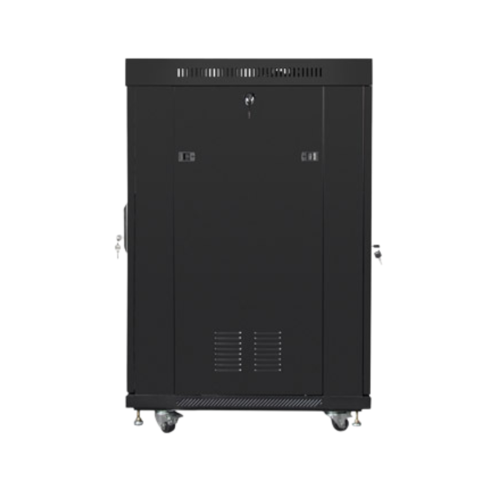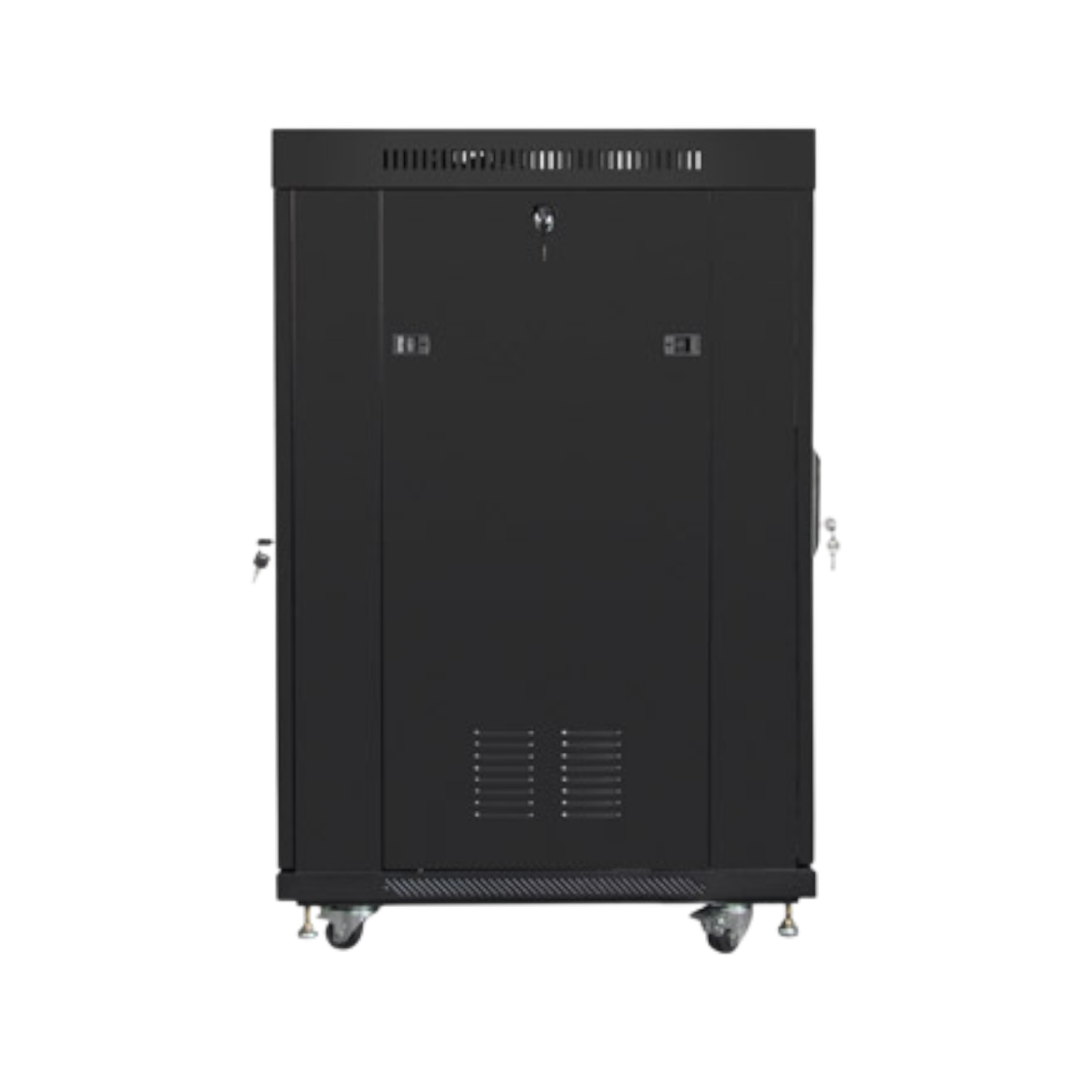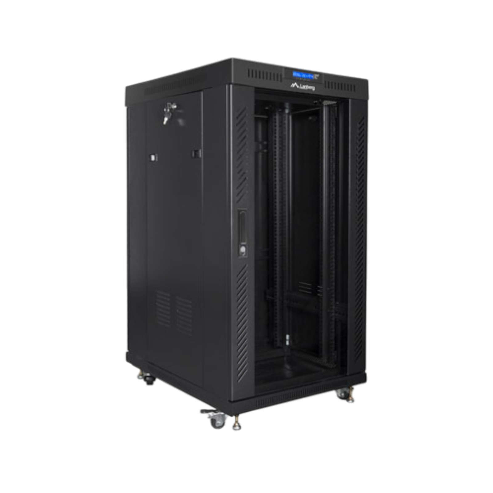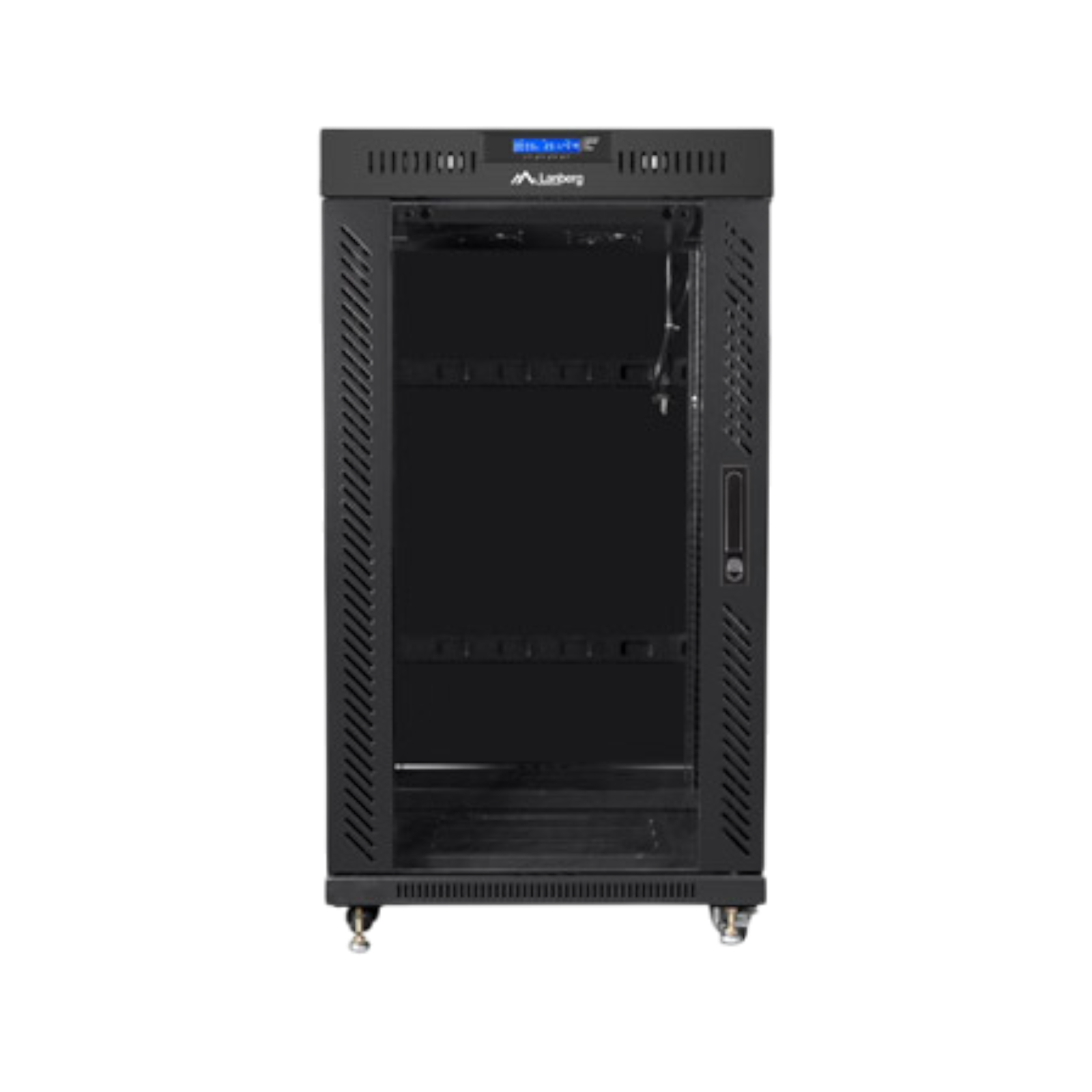 Lanberg 22U 800x800 mm LCD V2 to stojąca szafa rack w kolorze czarnym, wykonana z wytrzymałej stali. Wyposażona w przeszklone drzwi z hartowanego szkła, panel LCD, zdejmowane panele boczne i otwory na okablowanie, zapewnia wygodny montaż oraz ochronę sprzętu w biurach i serwerowniach.
