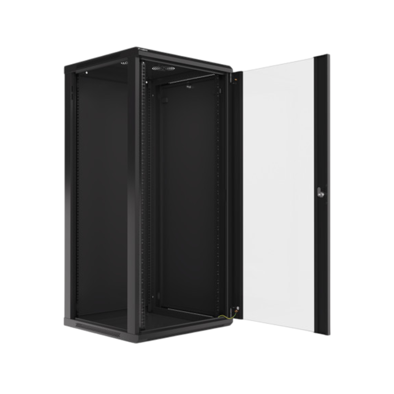 Szafa rack Lanberg 19" 27U 600x600 mm to solidna i kompaktowa konstrukcja do montażu urządzeń IT. Przeszklone drzwi z zamkiem chronią sprzęt, a zdejmowane panele boczne ułatwiają serwis. Otwory wentylacyjne umożliwiają instalację wentylatorów, a nośność 60 kg zapewnia stabilność i bezpieczeństwo.