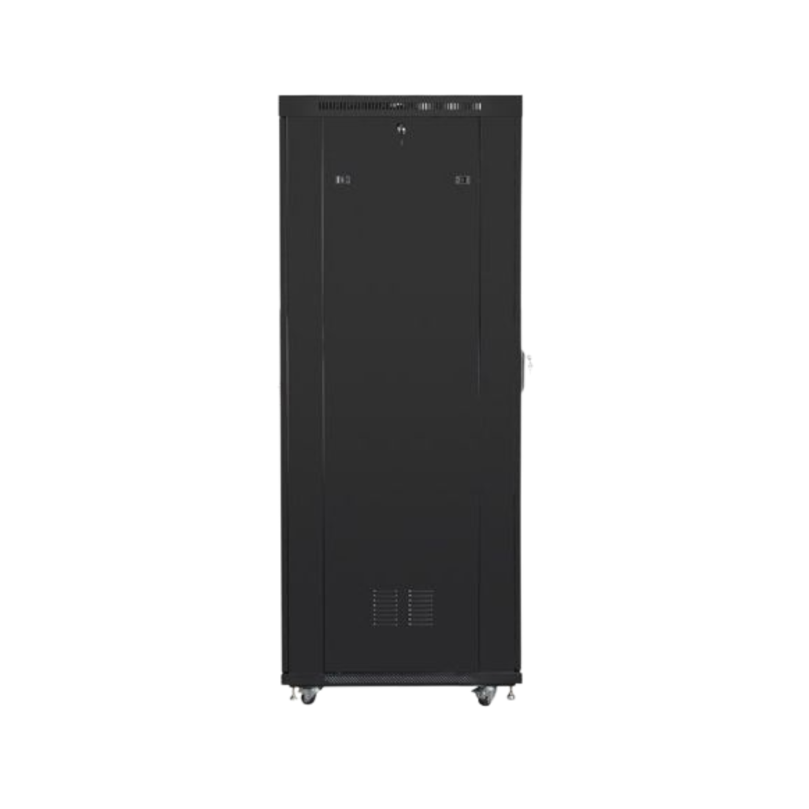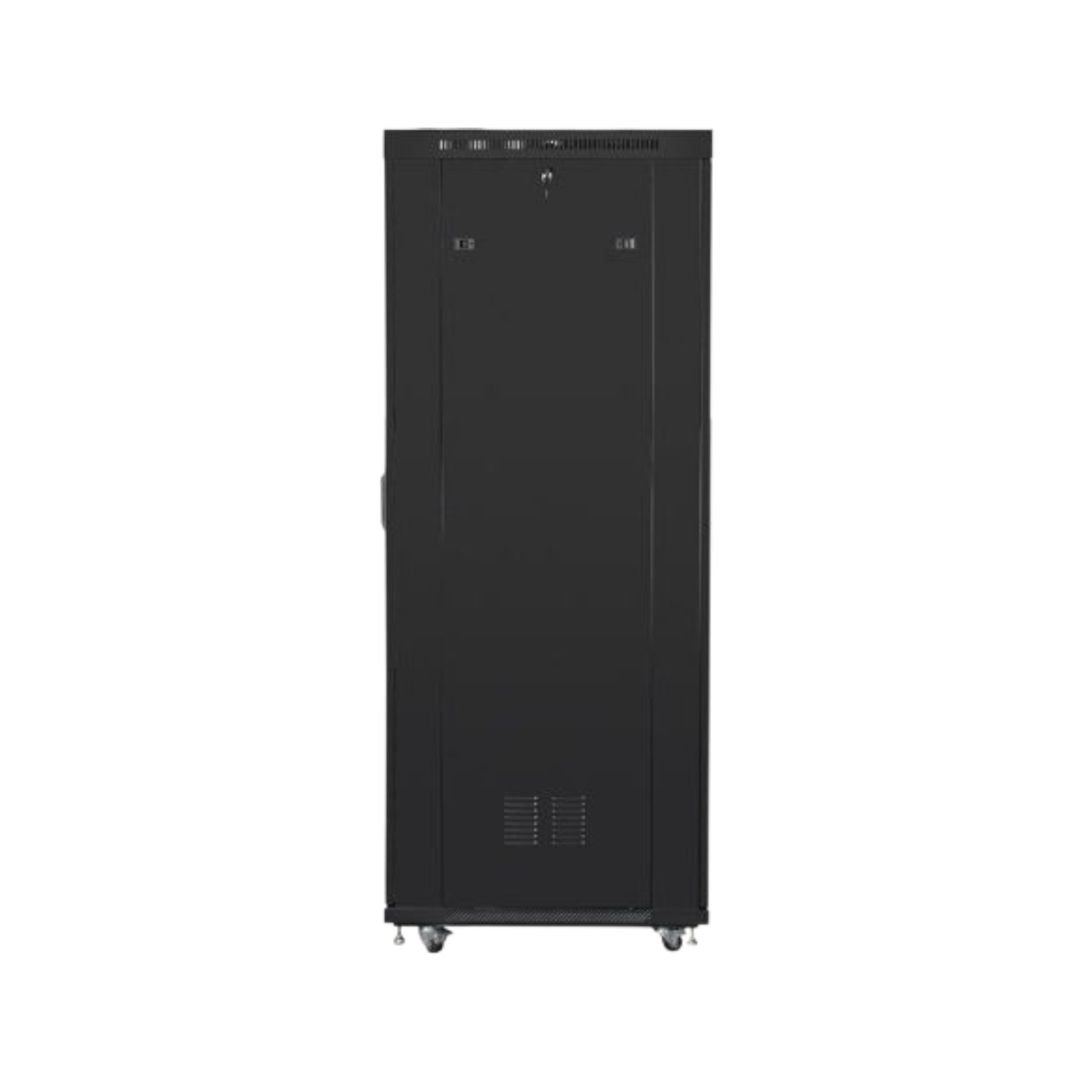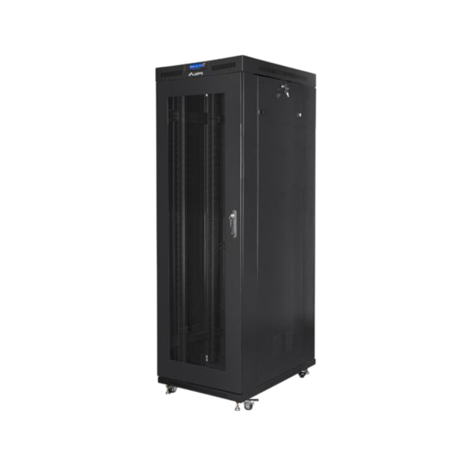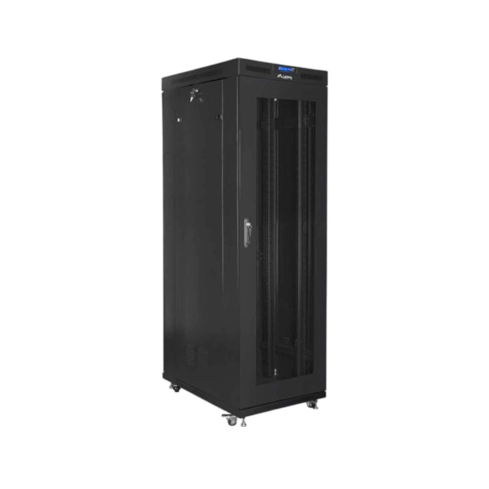 Lanberg 27U 800x1000 mm to stojąca szafa rack w kolorze czarnym, wykonana z wytrzymałej stali. Wyposażona w drzwi perforowane, panel LCD, zdejmowane panele boczne i otwory na okablowanie, zapewnia wygodny montaż oraz ochronę sprzętu w biurach i serwerowniach.