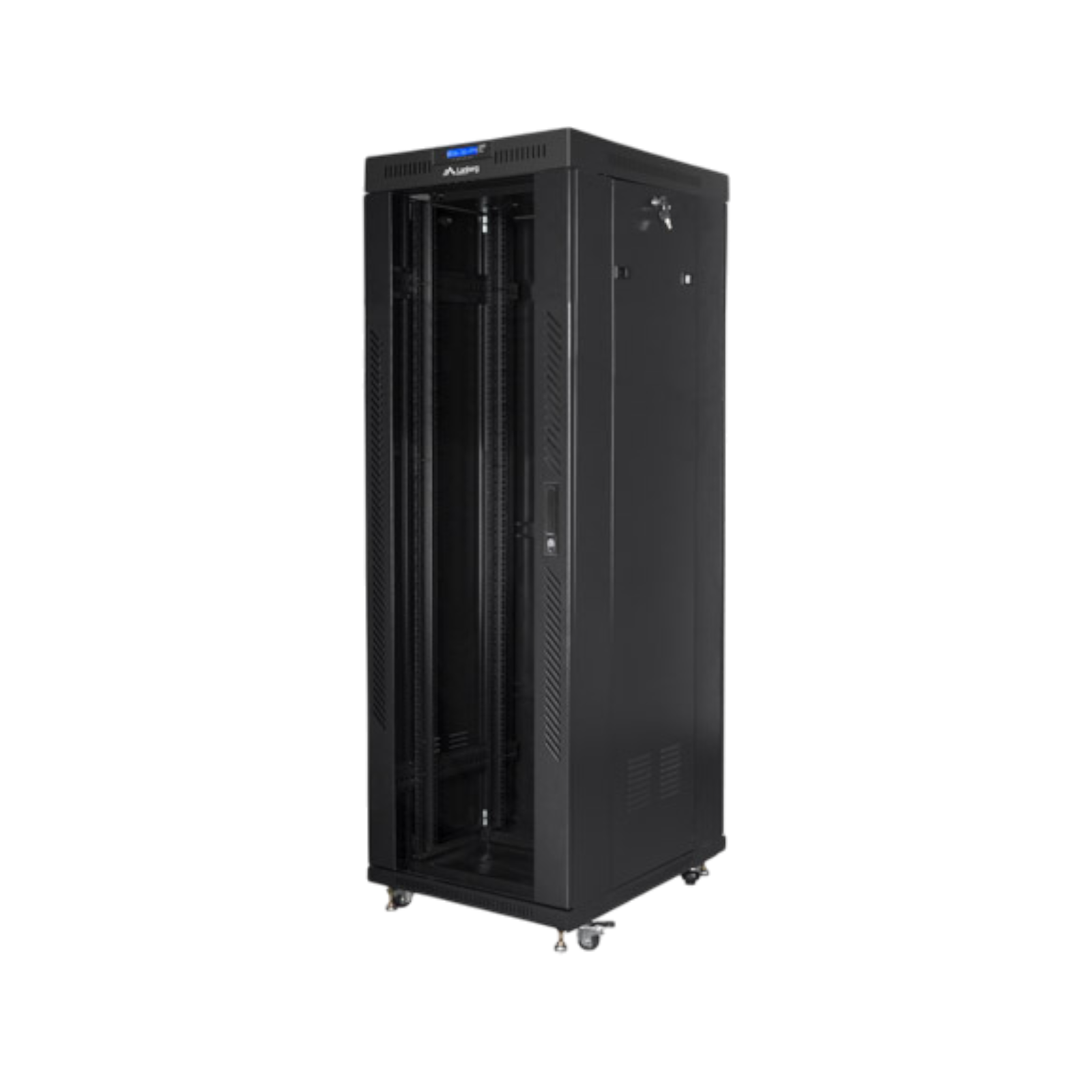 Lanberg 37U 600x800 mm LCD V2 to stojąca szafa rack w kolorze czarnym, wykonana z wytrzymałej stali. Wyposażona w przeszklone drzwi z hartowanego szkła, panel LCD, zdejmowane panele boczne i otwory na okablowanie, zapewnia wygodny montaż oraz ochronę sprzętu w biurach i serwerowniach.