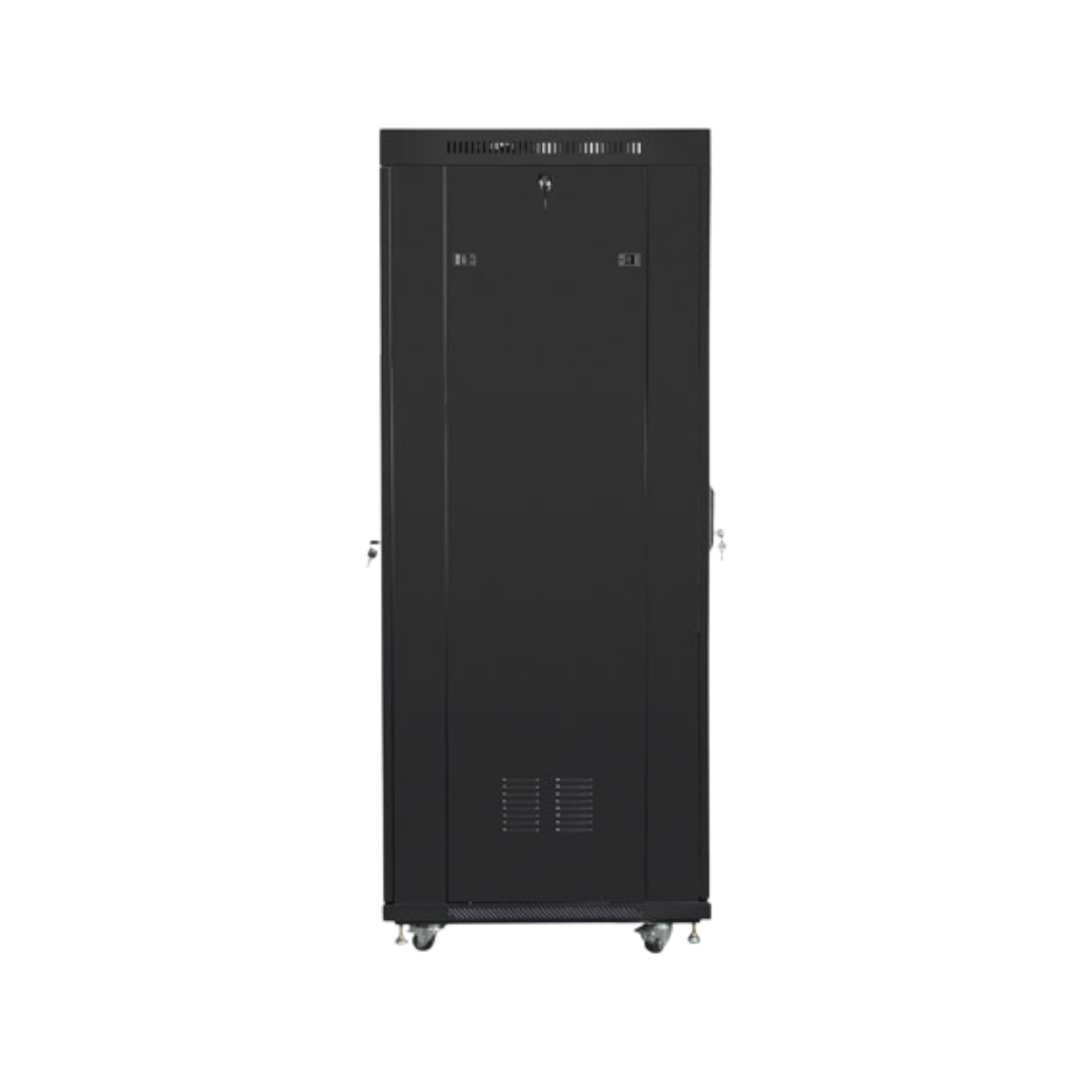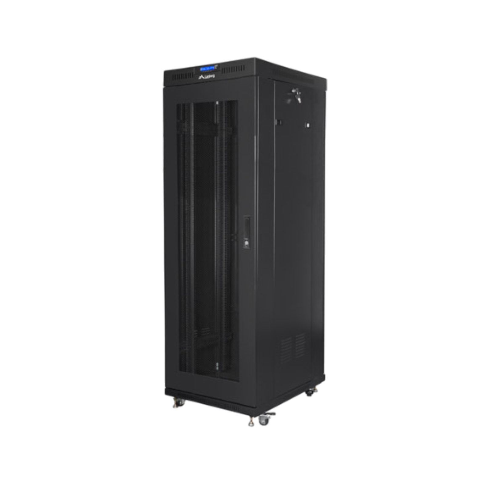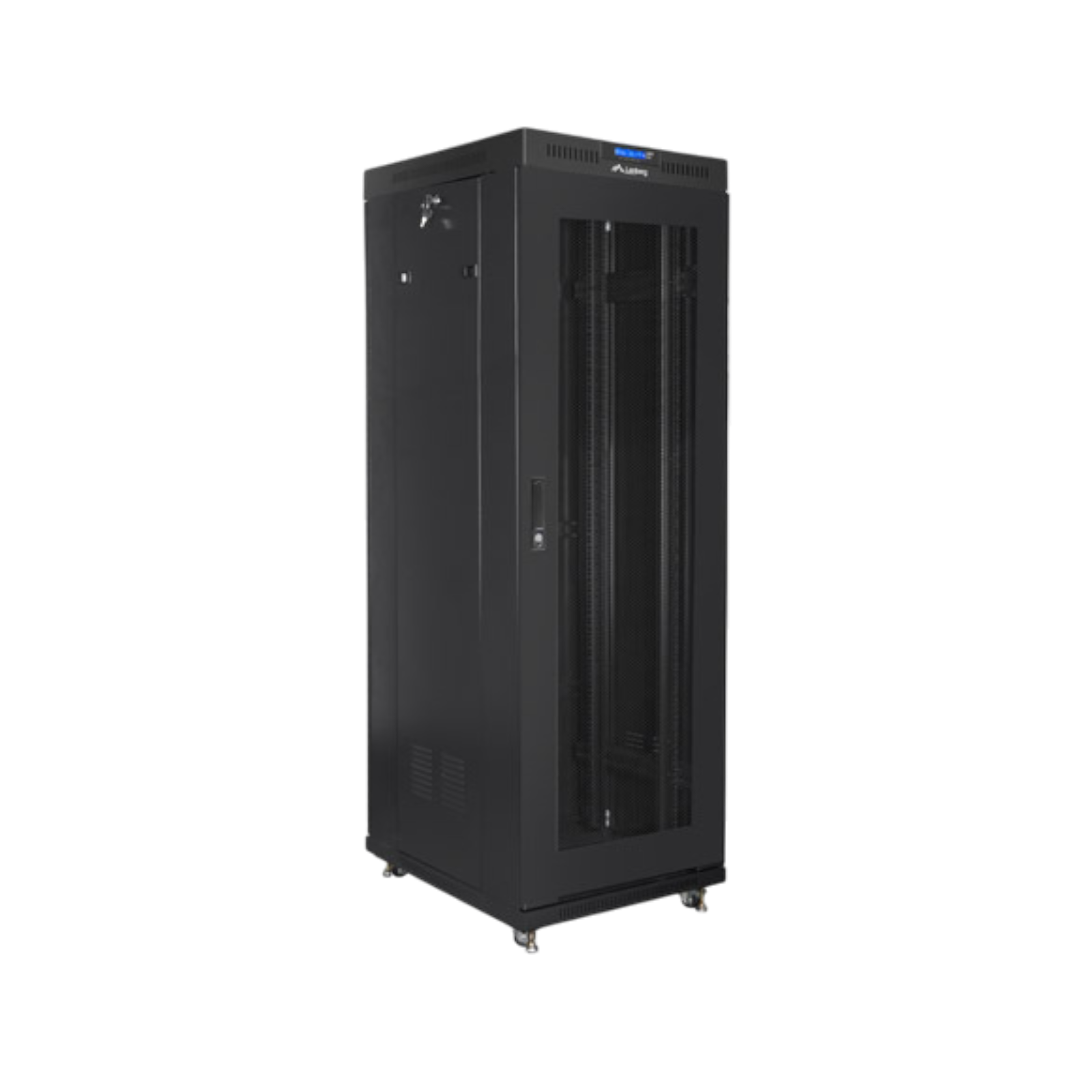 Lanberg 37U 600x800 mm to stojąca szafa rack w kolorze czarnym, wykonana z wytrzymałej stali. Wyposażona w drzwi perforowane, panel LCD, zdejmowane panele boczne i otwory na okablowanie, zapewnia wygodny montaż oraz ochronę sprzętu w biurach i serwerowniach.