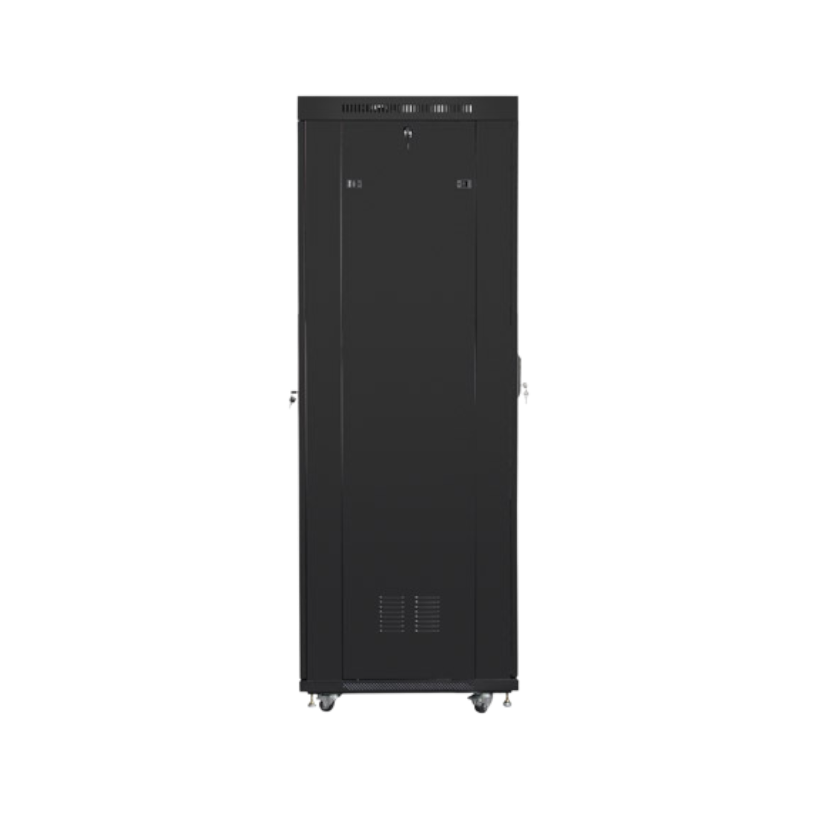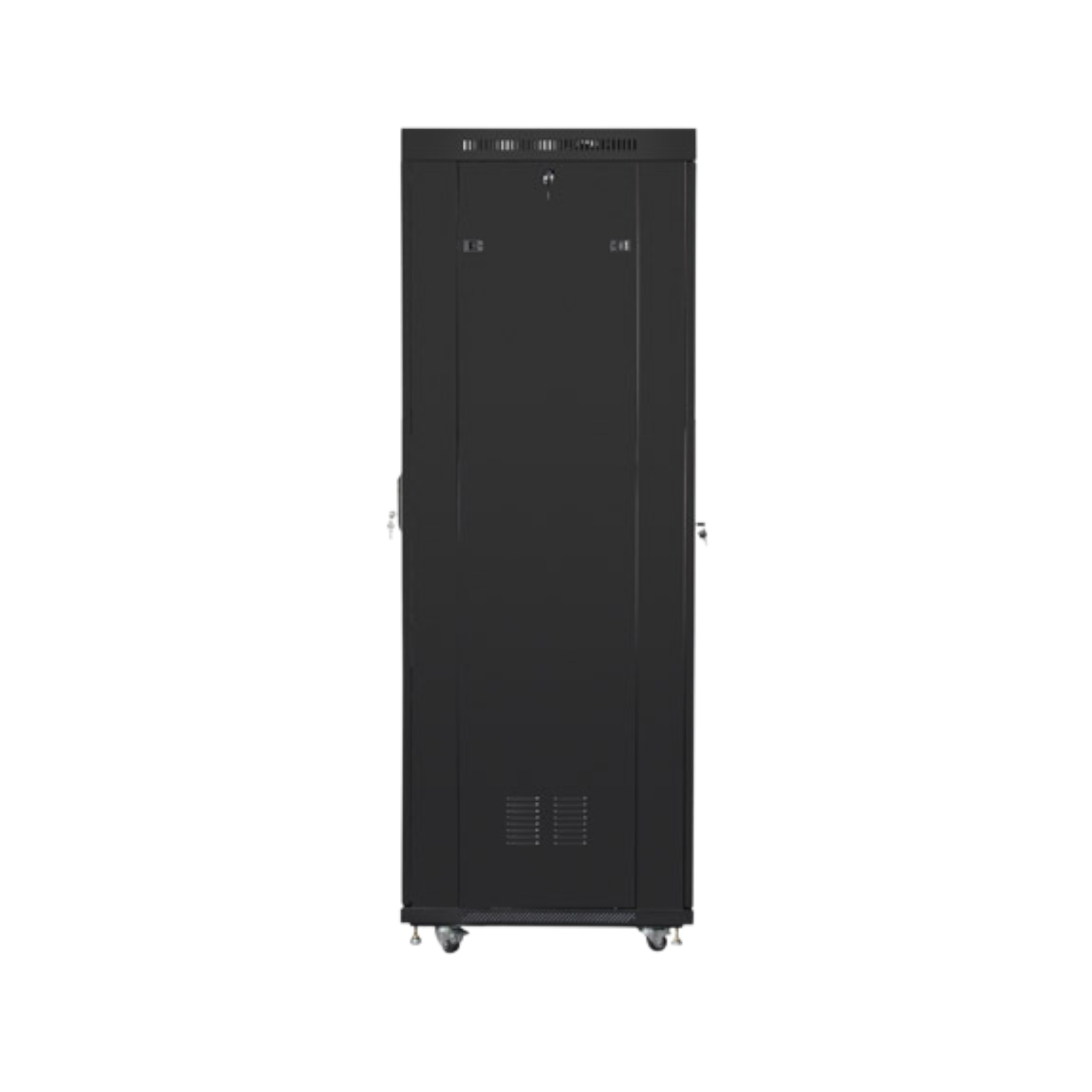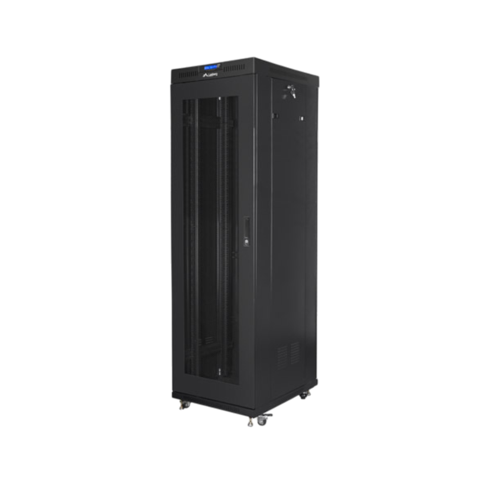 Lanberg 42U 600x800 mm to stojąca szafa rack w kolorze czarnym, wykonana z wytrzymałej stali. Wyposażona w drzwi perforowane, panel LCD, zdejmowane panele boczne i otwory na okablowanie, zapewnia wygodny montaż oraz ochronę sprzętu w biurach i serwerowniach.