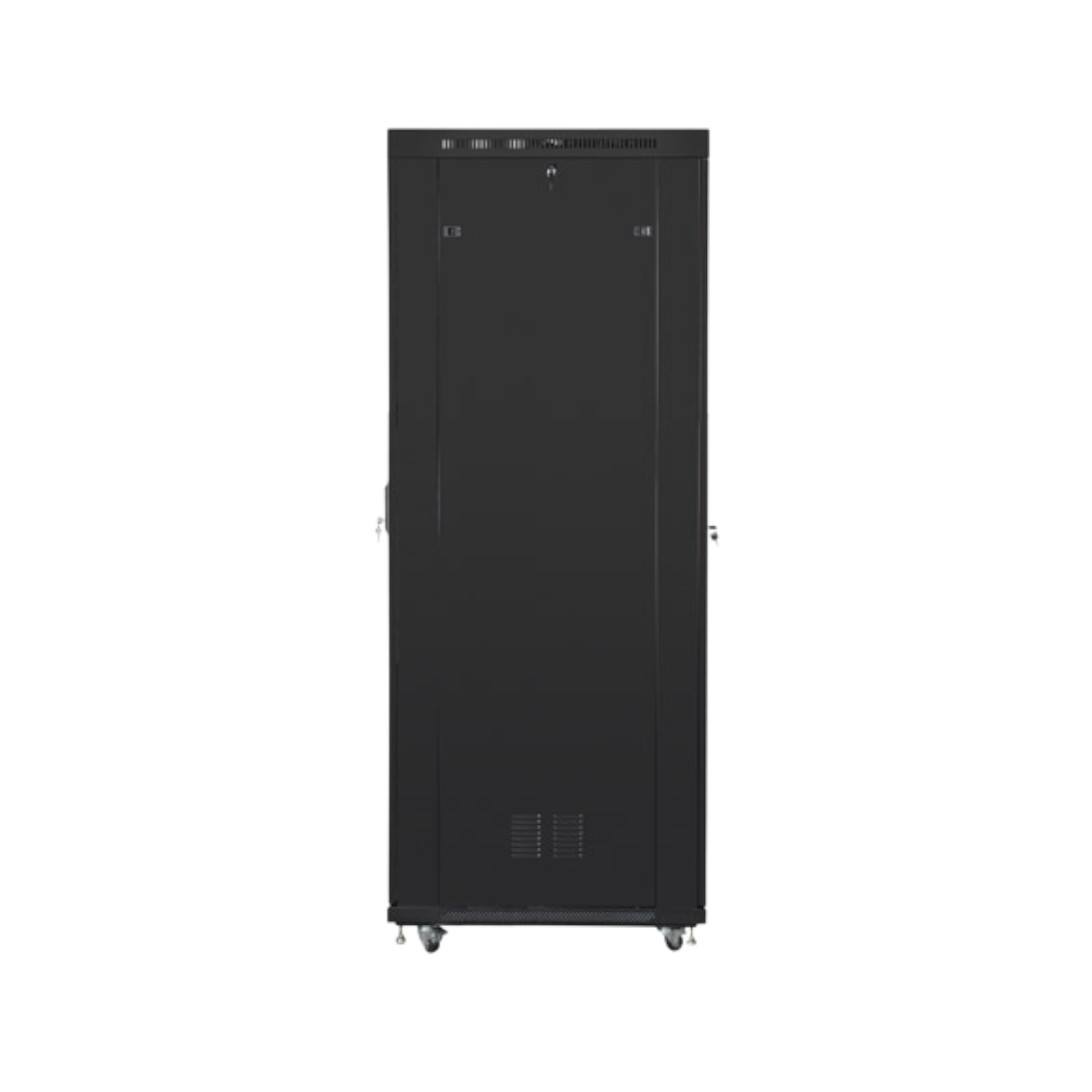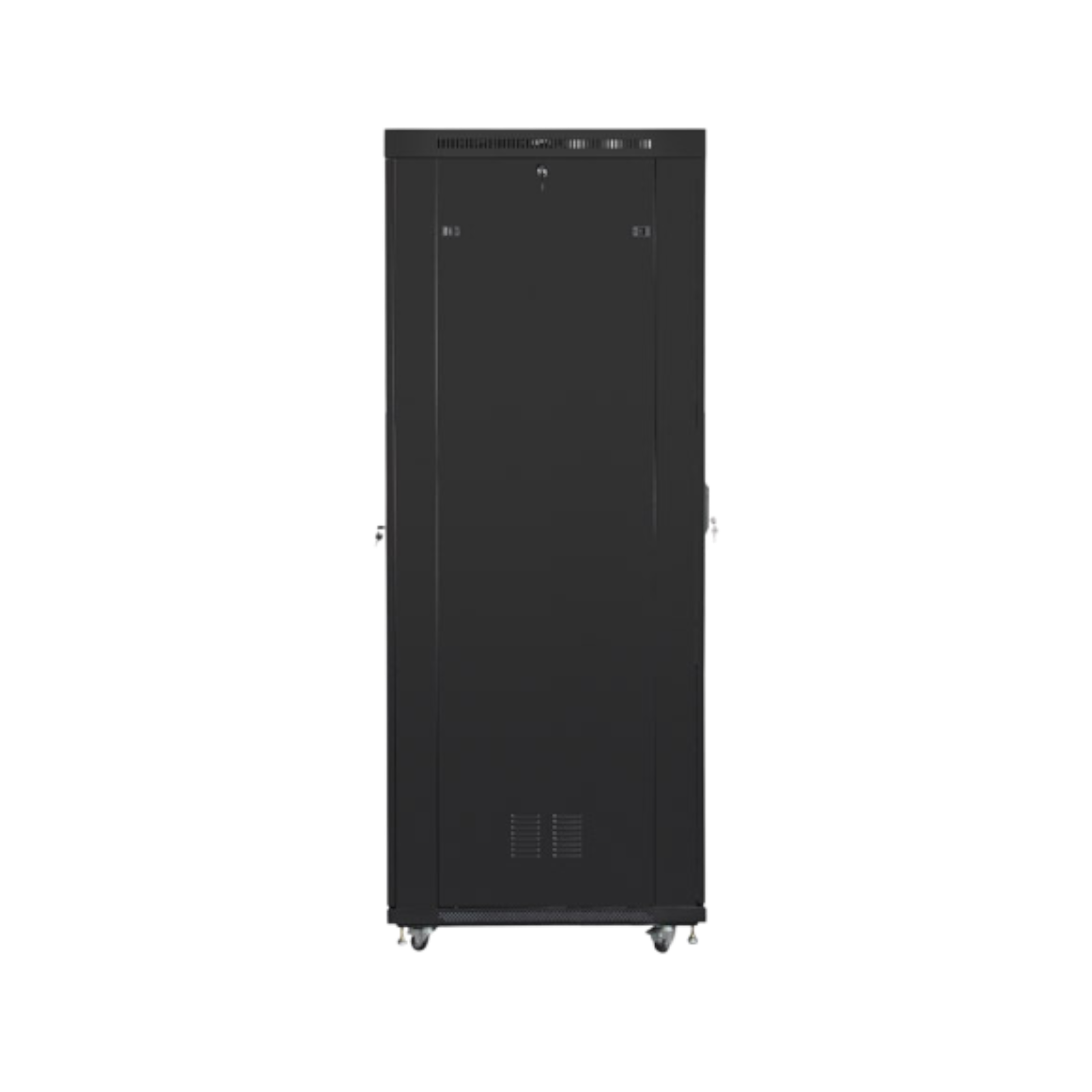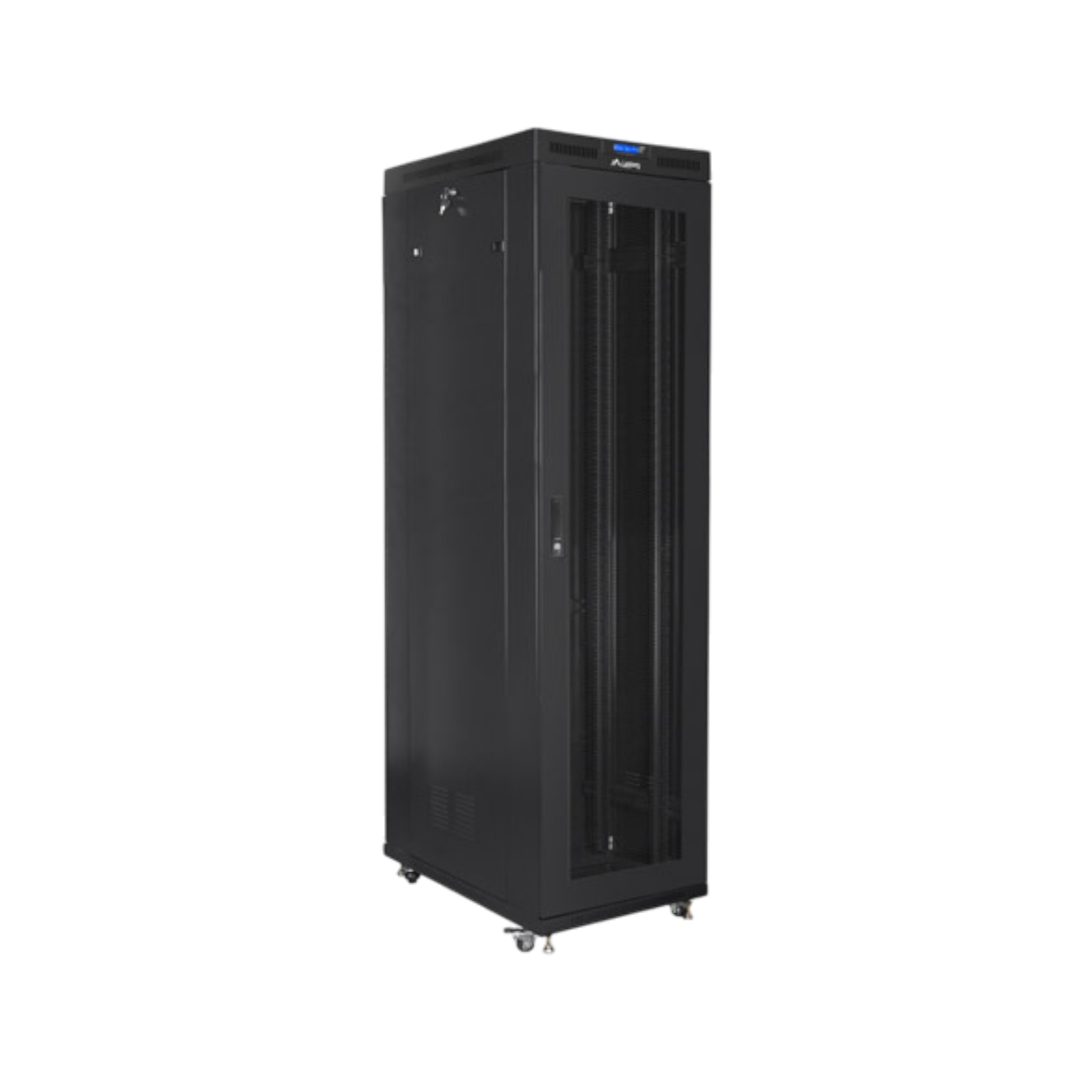 Lanberg 47U 800x1000 mm to stojąca szafa rack w kolorze czarnym, wykonana z wytrzymałej stali. Wyposażona w drzwi perforowane, panel LCD, zdejmowane panele boczne i otwory na okablowanie, zapewnia wygodny montaż oraz ochronę sprzętu w biurach i serwerowniach.