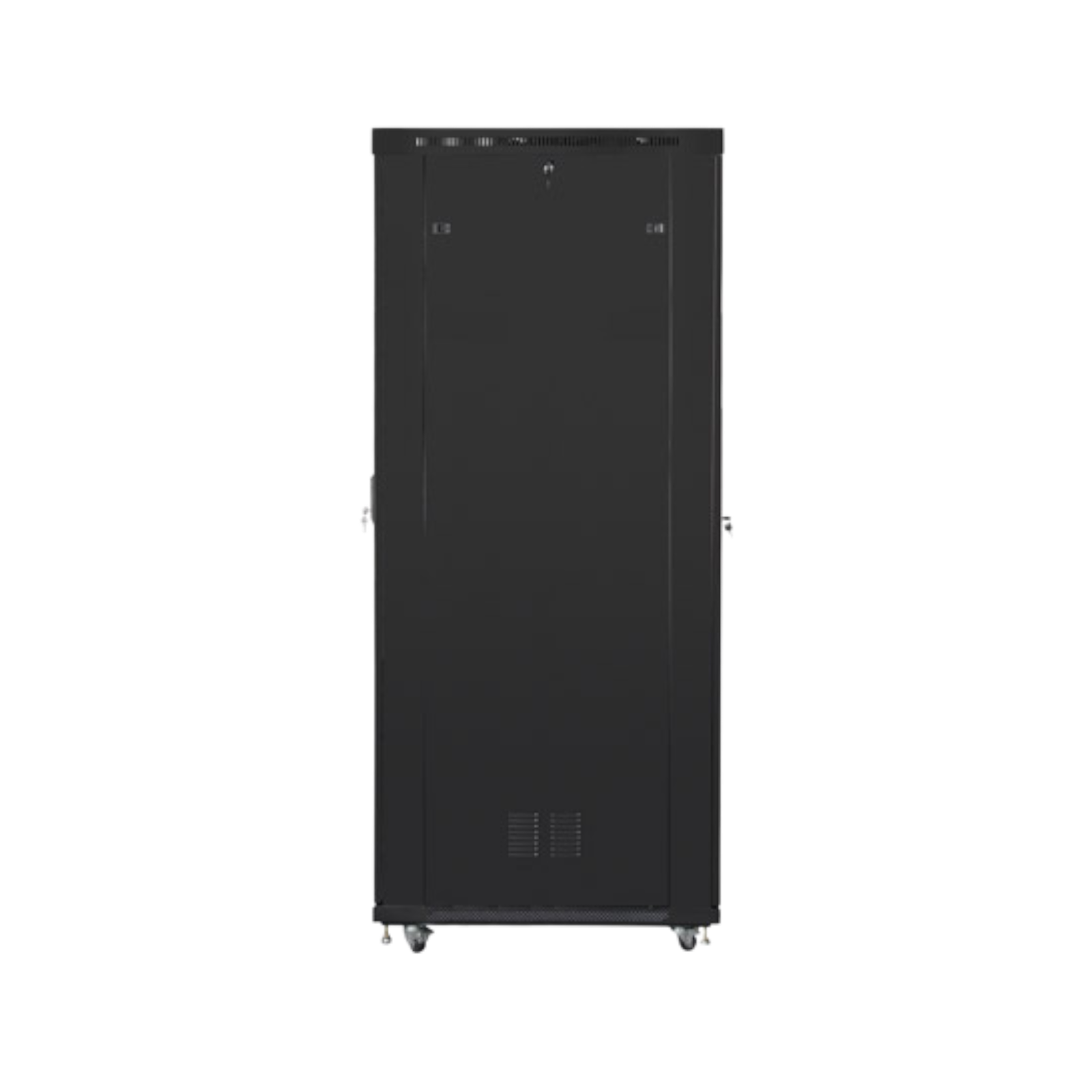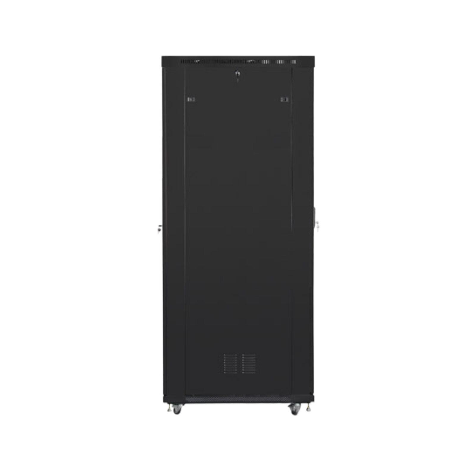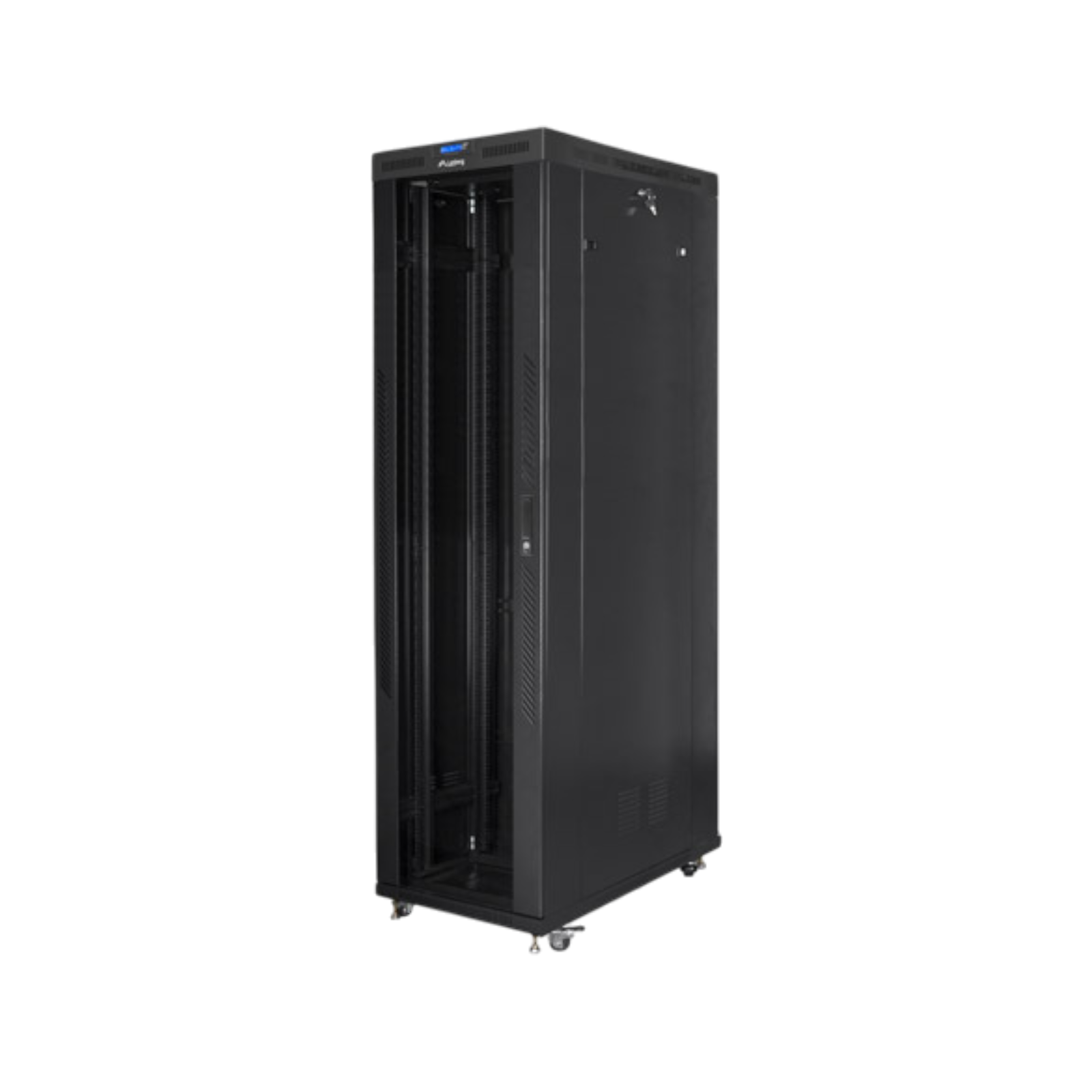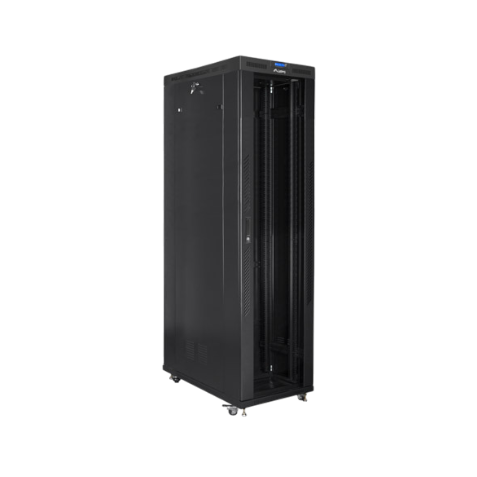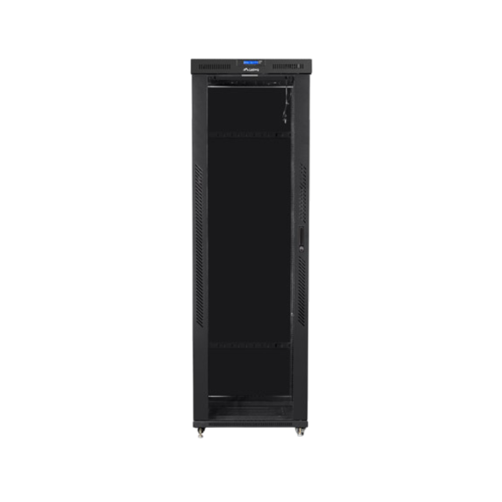Lanberg 47U 800x1200 mm to stojąca szafa rack w kolorze czarnym, wykonana z wytrzymałej stali. Wyposażona w przeszklone drzwi z hartowanego szkła, panel LCD, zdejmowane panele boczne i otwory na okablowanie, zapewnia wygodny montaż oraz ochronę sprzętu w biurach i serwerowniach.