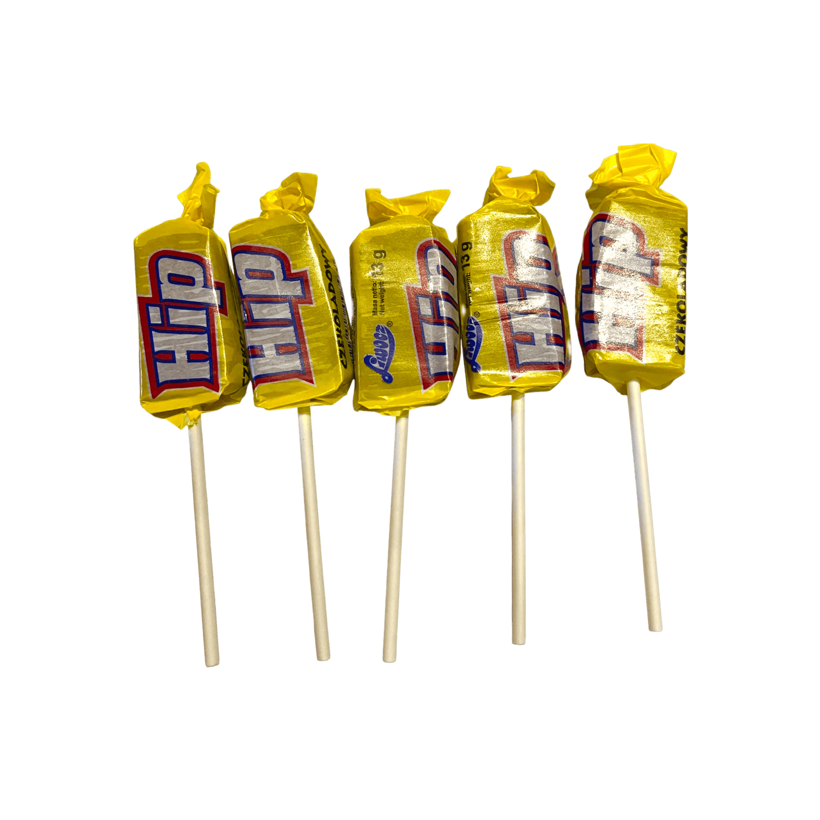 Wyobraź sobie charakterystyczny żółty papier z wielkim napisem HIP – to był symbol słodyczy dzieciństwa. Ten czekoladowo‑toffi lizak, owinięty w papier, trzymany na patyczku, budził tyle rozkoszy, co strachu – bo nie jeden odważny próbował oderwać go zębami i… żegnaj mleczaku.