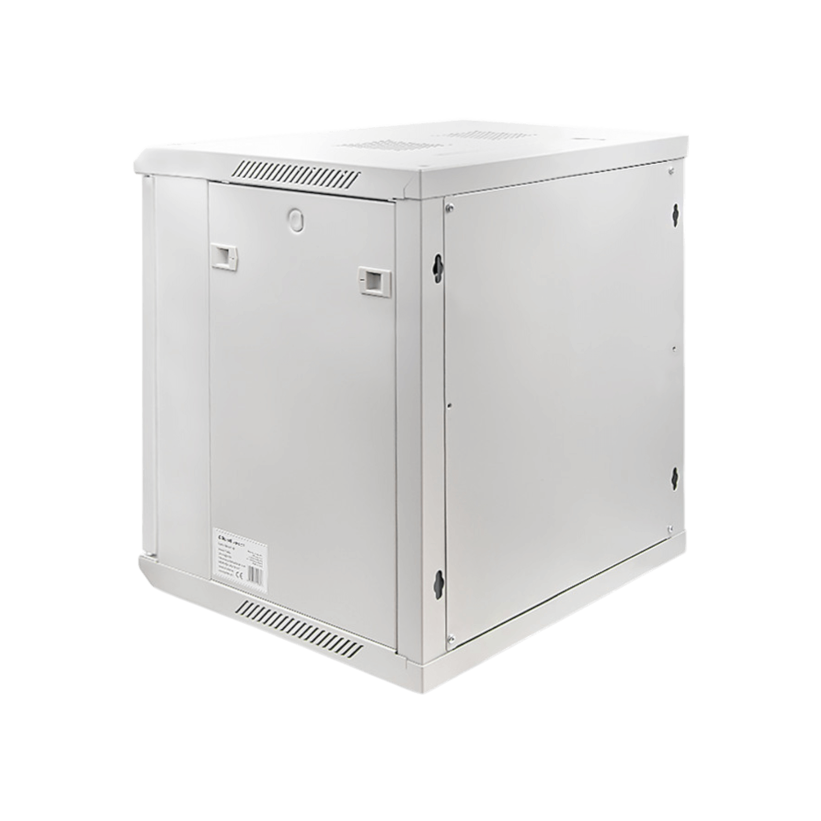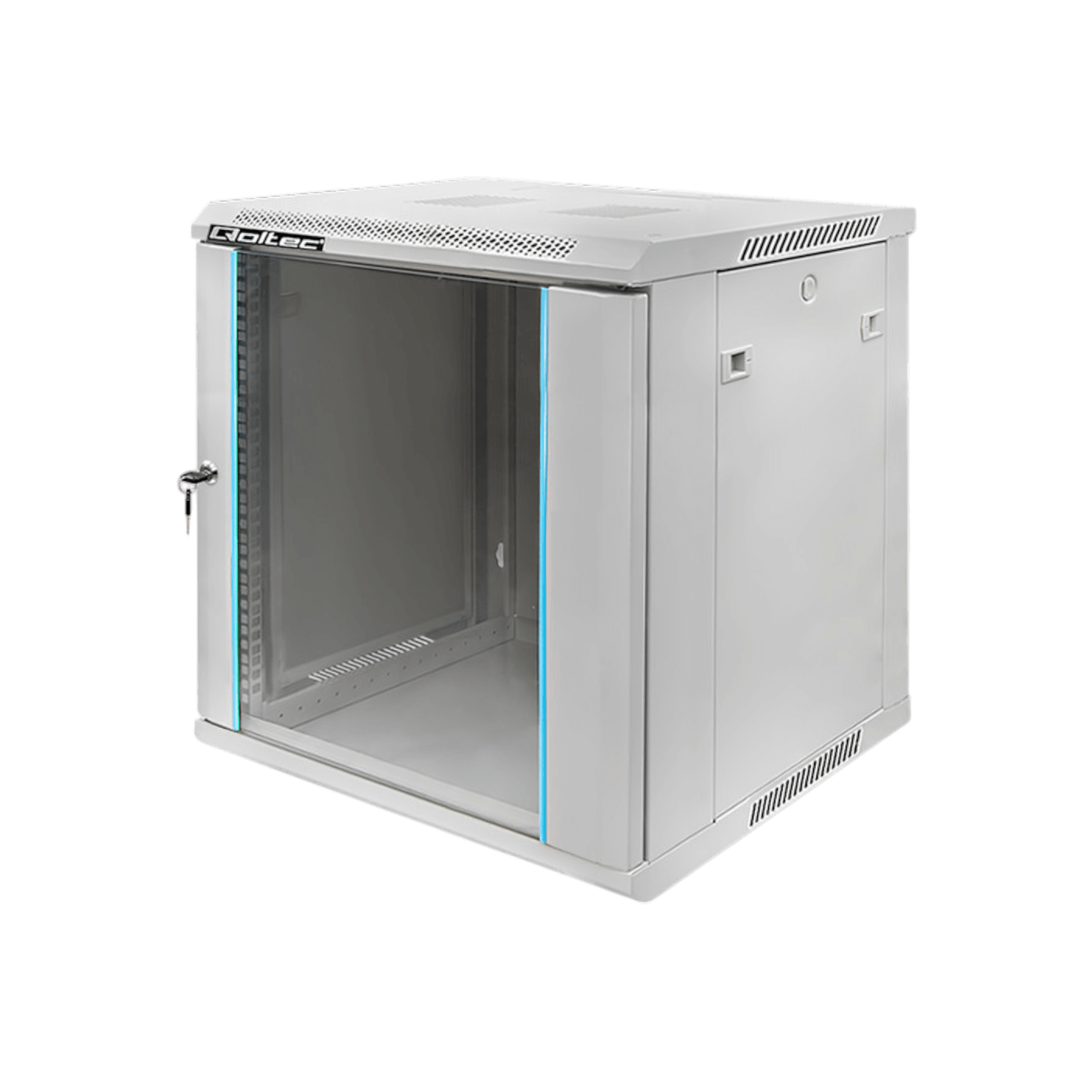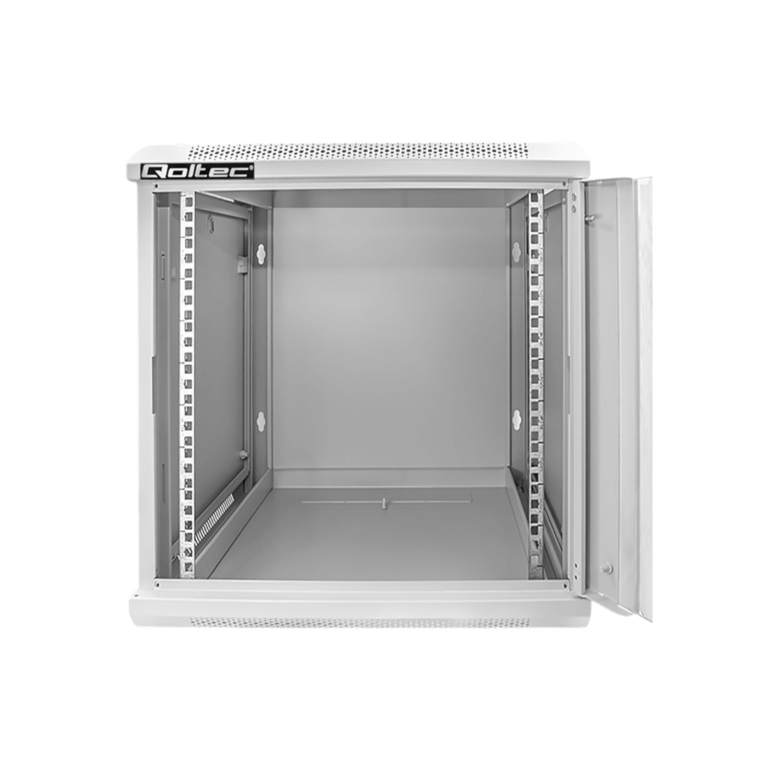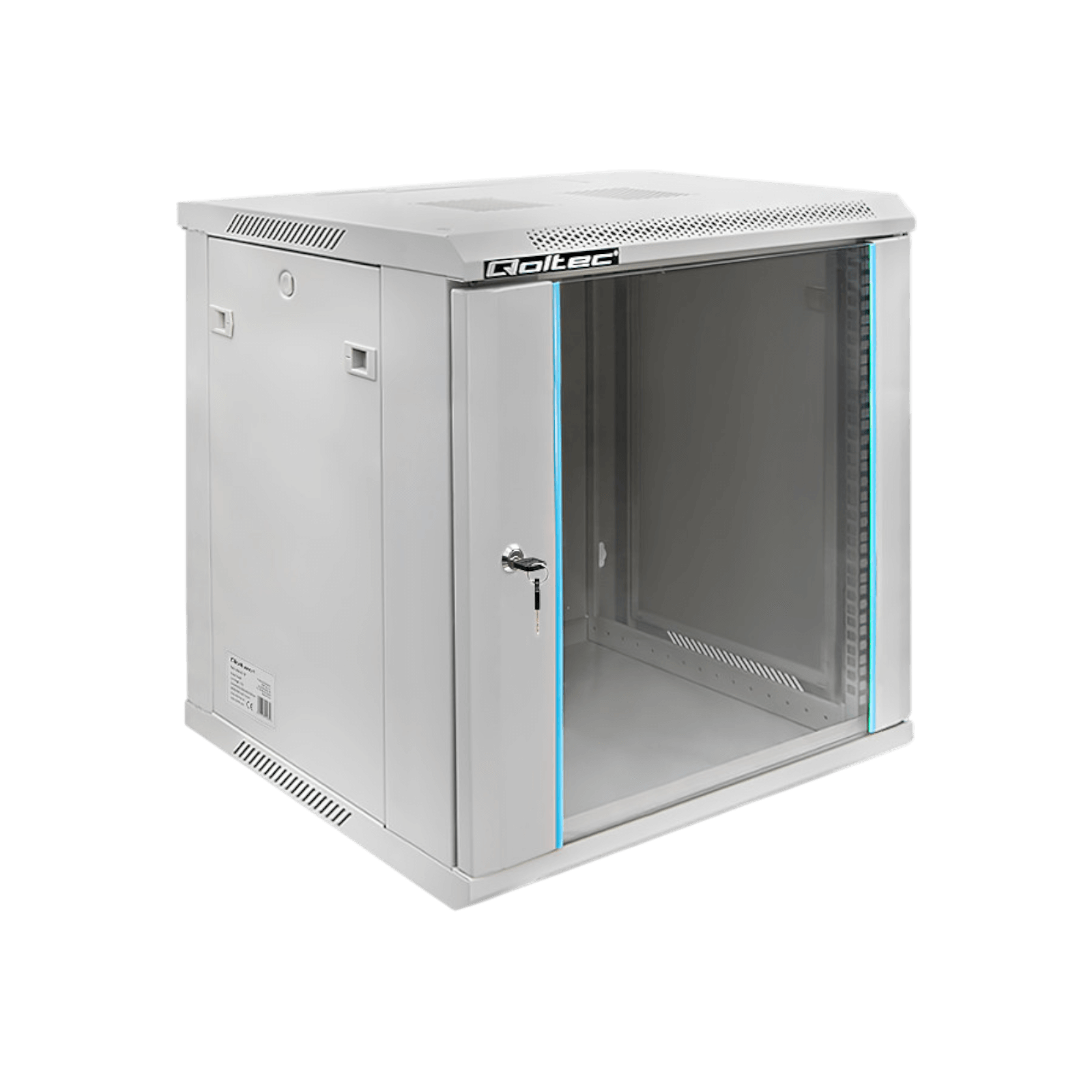 Qoltec 19" 12U 600x635x450 mm to wisząca szafa rack w kolorze szarym, wykonana z trwałej stali SPCC. Wyposażona w przeszklone drzwi z zamkiem oraz perforację zapewniającą wentylację, jest idealna do bezpiecznego montażu urządzeń IT w biurach, serwerowniach i systemach CCTV.