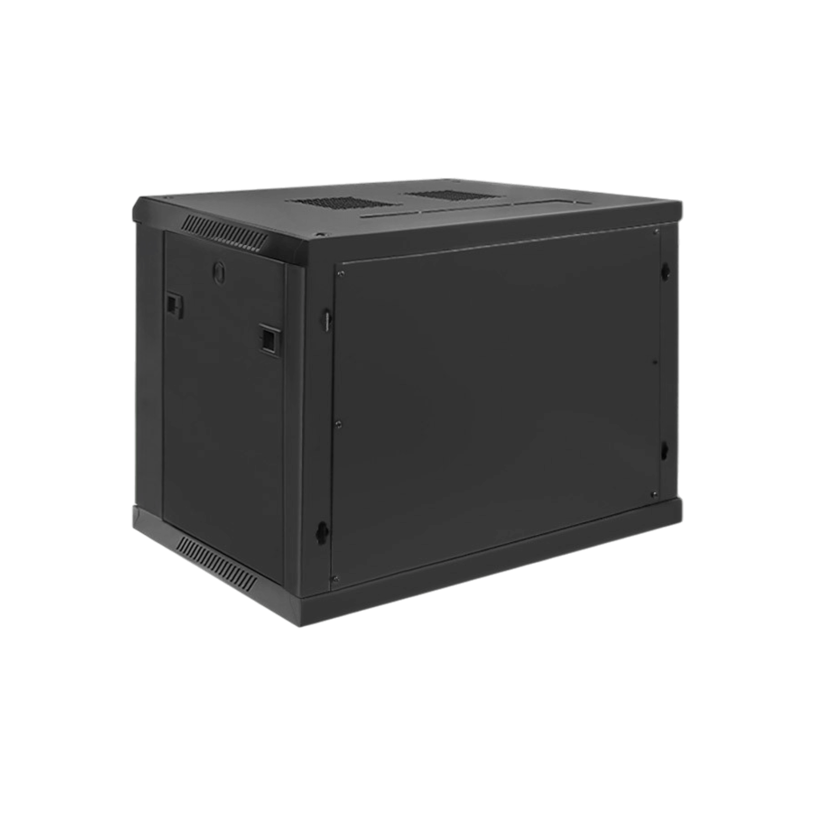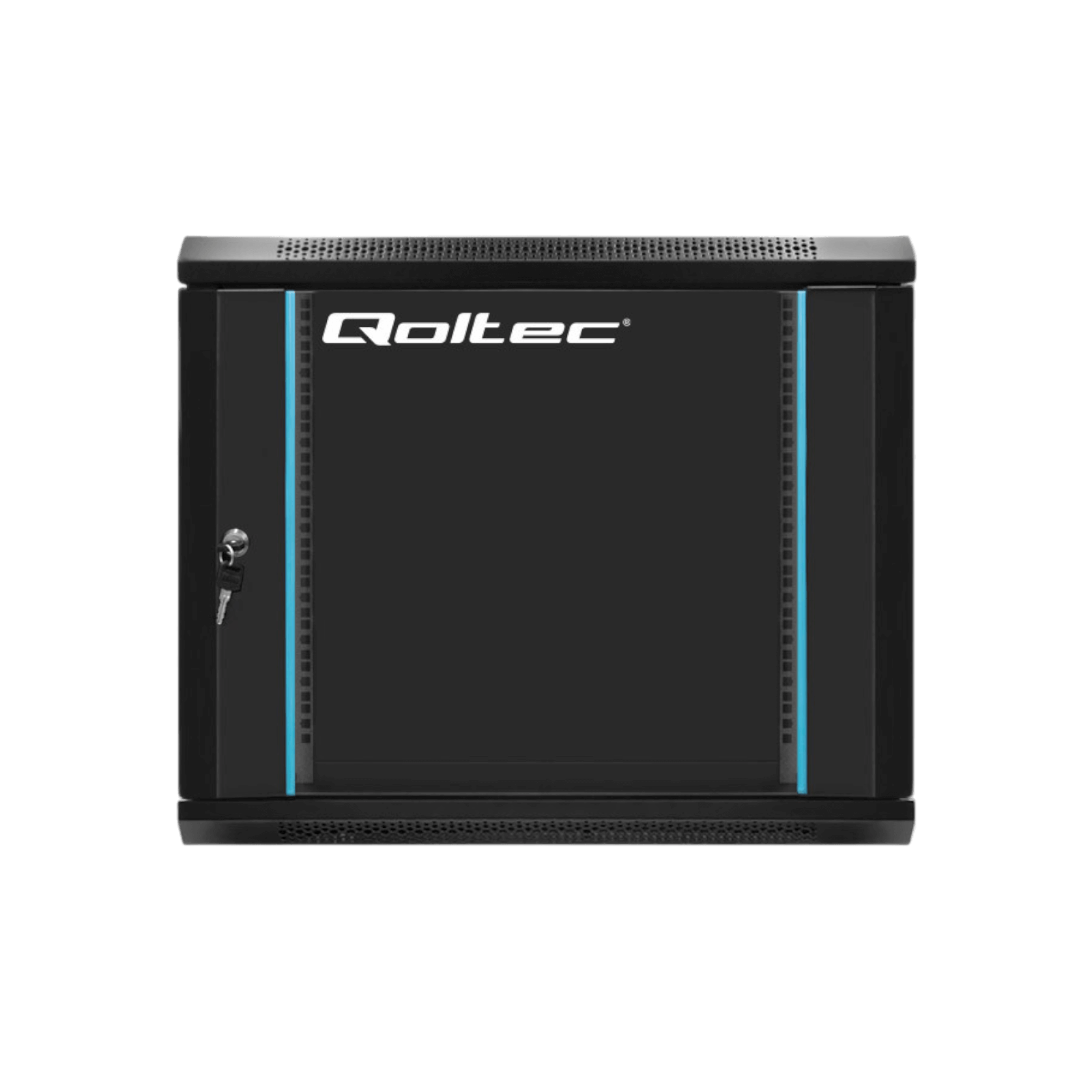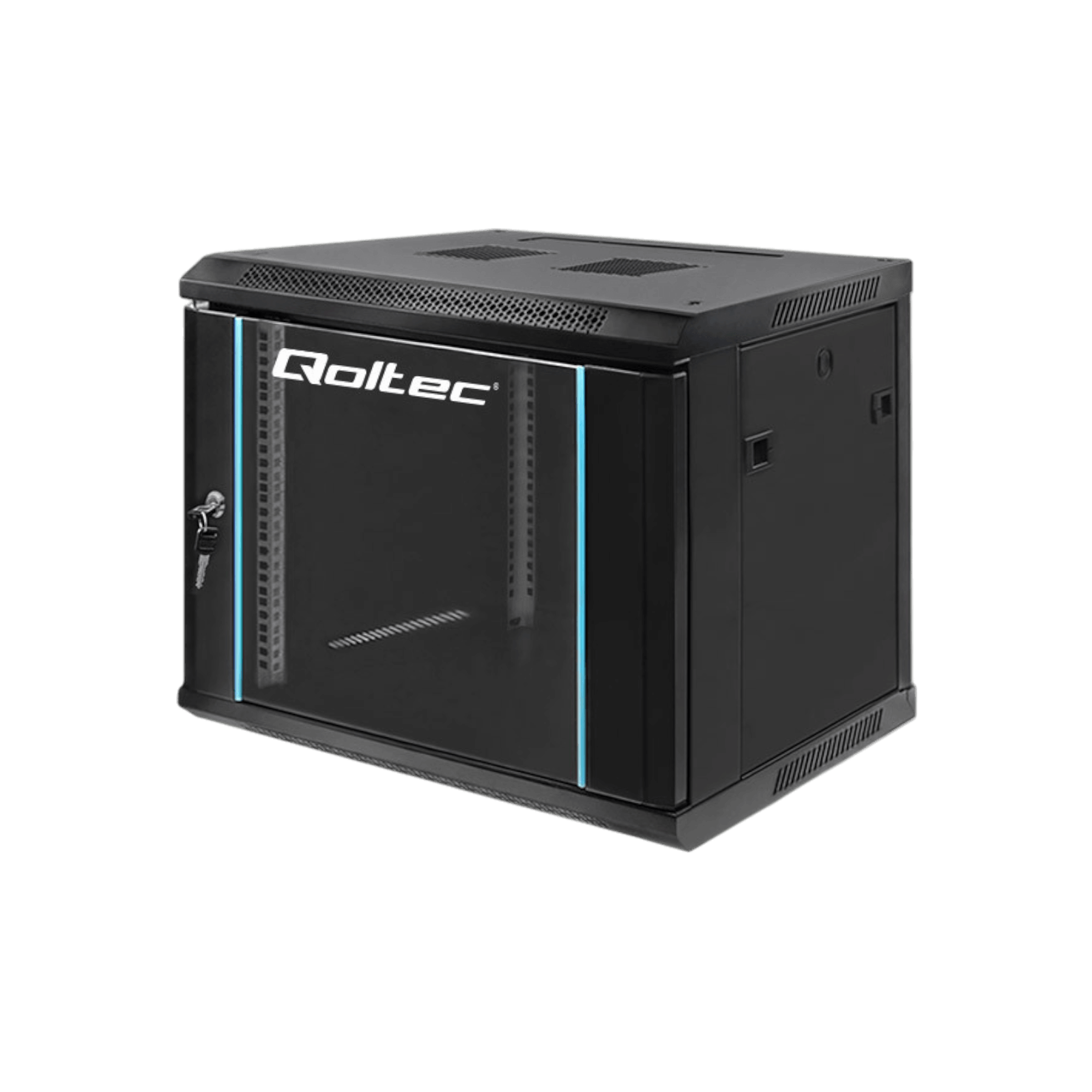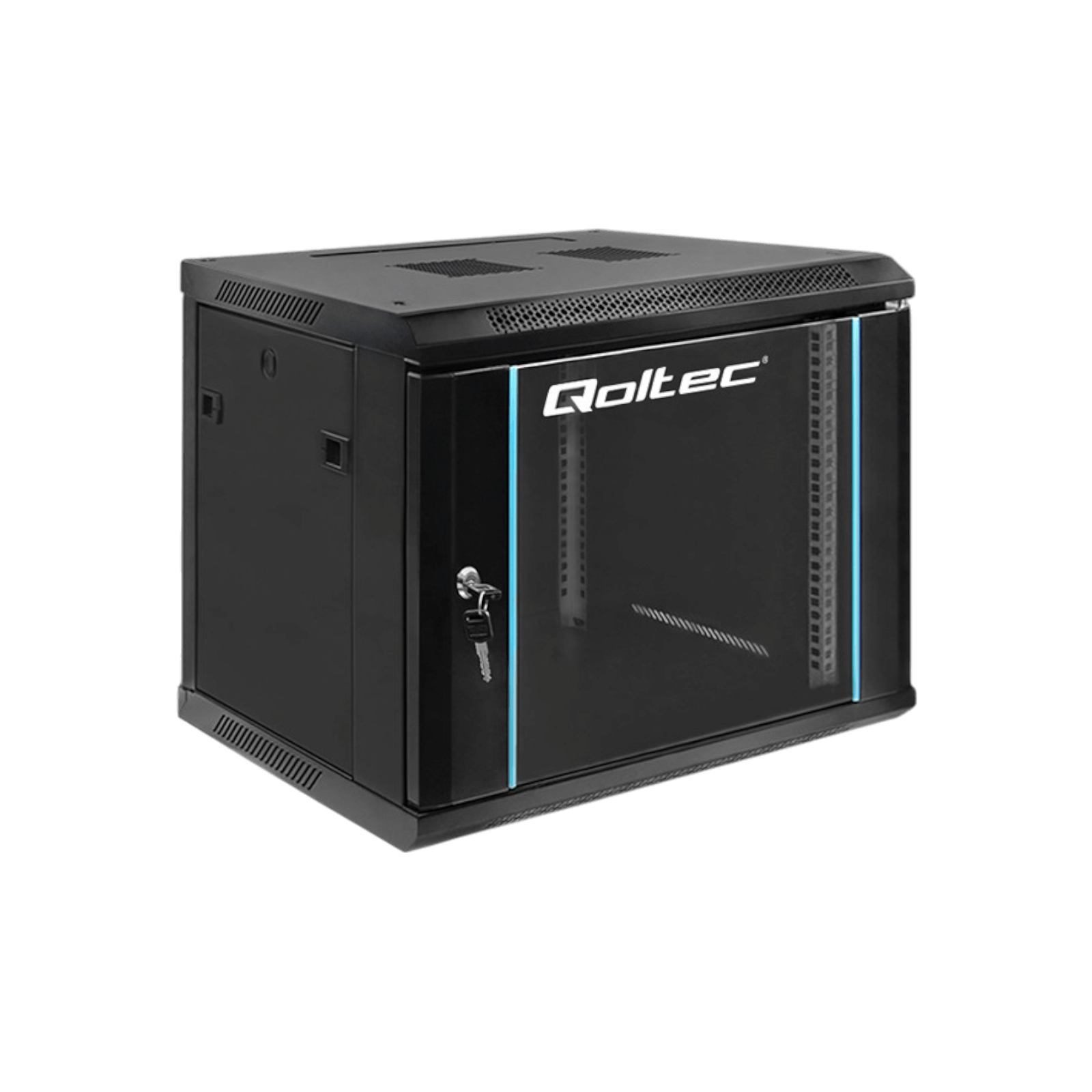 Qoltec 19" 9U 600x500x450 mm to wisząca szafa rack w kolorze czarnym, wykonana z trwałej stali SPCC. Wyposażona w przeszklone drzwi z zamkiem oraz perforację zapewniającą wentylację, jest idealna do bezpiecznego montażu urządzeń IT w biurach, serwerowniach i systemach CCTV.